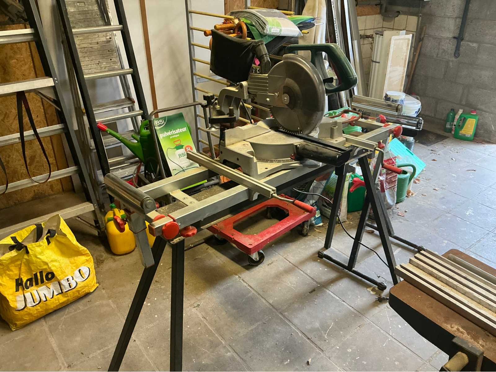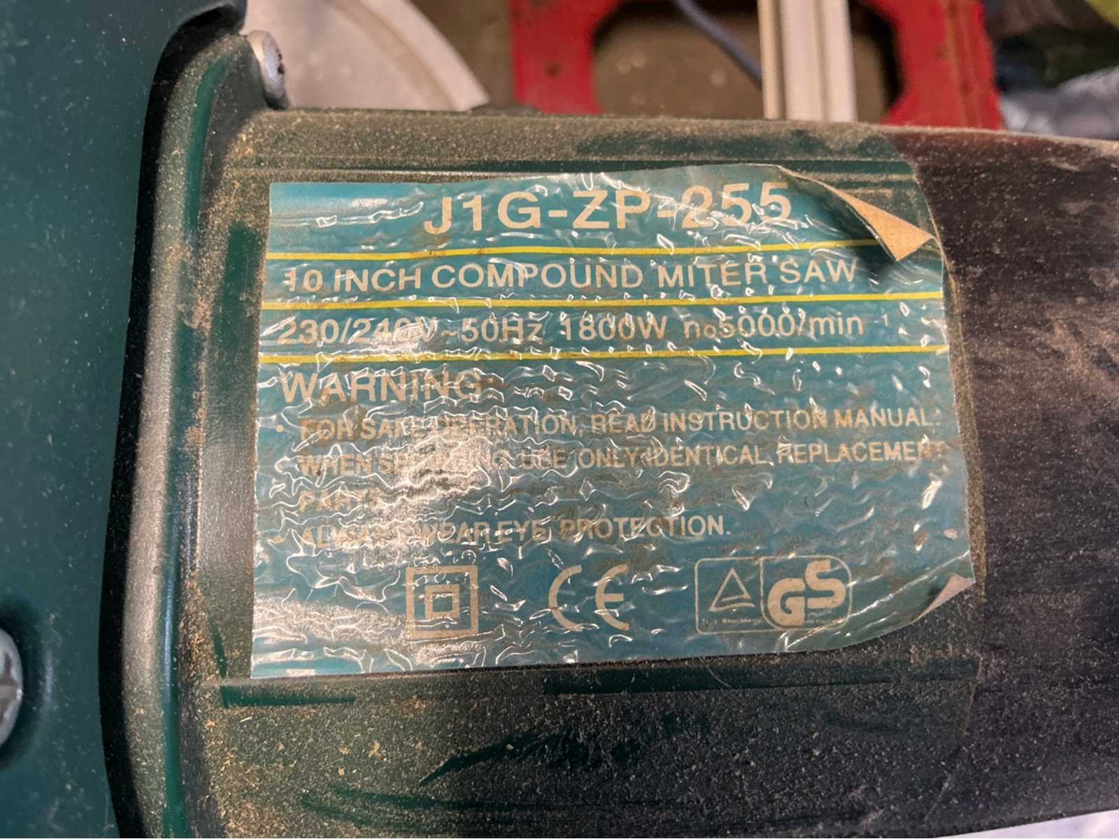 Uit professionele werkplaats aangeboden: Afkort- en verstekzaag Power Tool J1G-ZP-255 (10 inch, 1800 W) met stevig onderstel en extra zij poot. Geschikt voor het zagen van hout, kunststof of lichte metalen onder diverse hoeken. Krachtige motor (5000 t/min) en robuuste bouw, ideaal voor werkplaats of hobbygebruik. Nee Merk: Power Tool Type: J1G-ZP-255