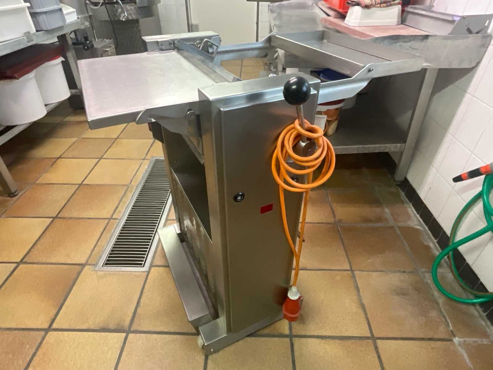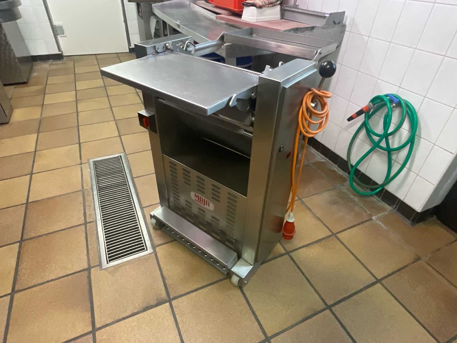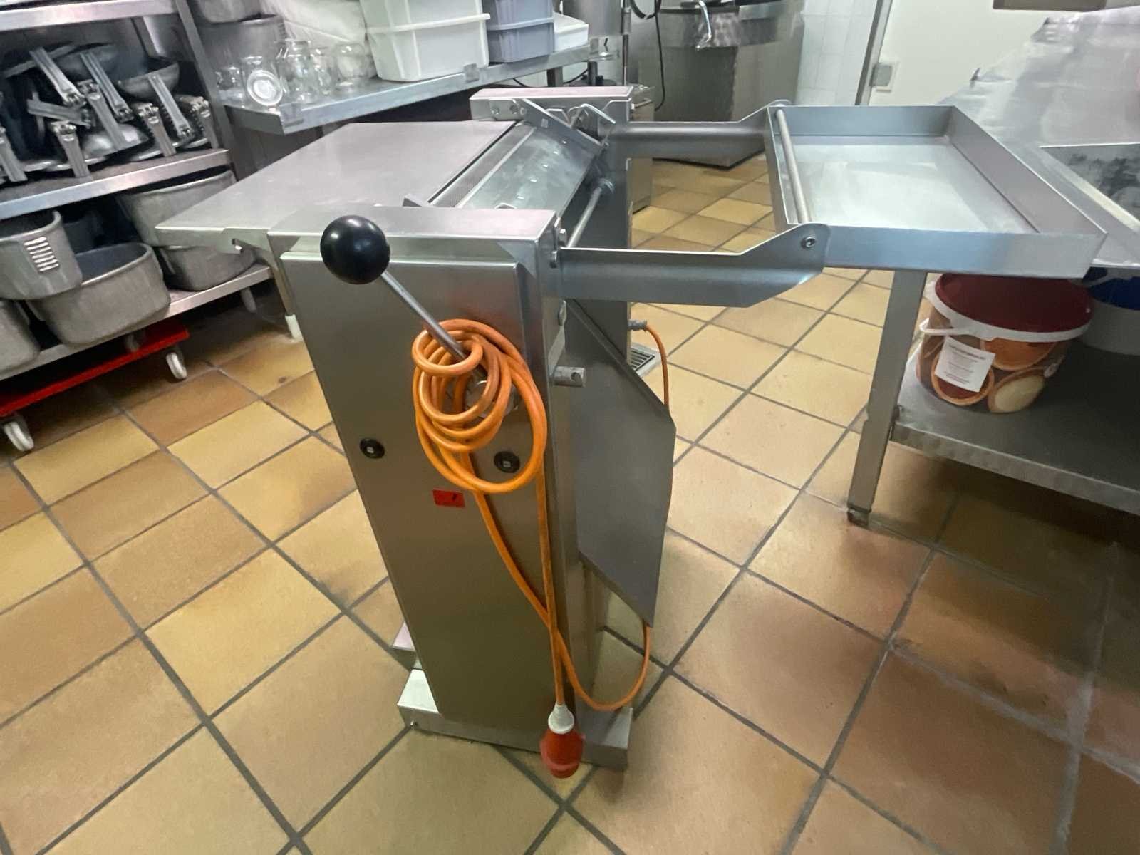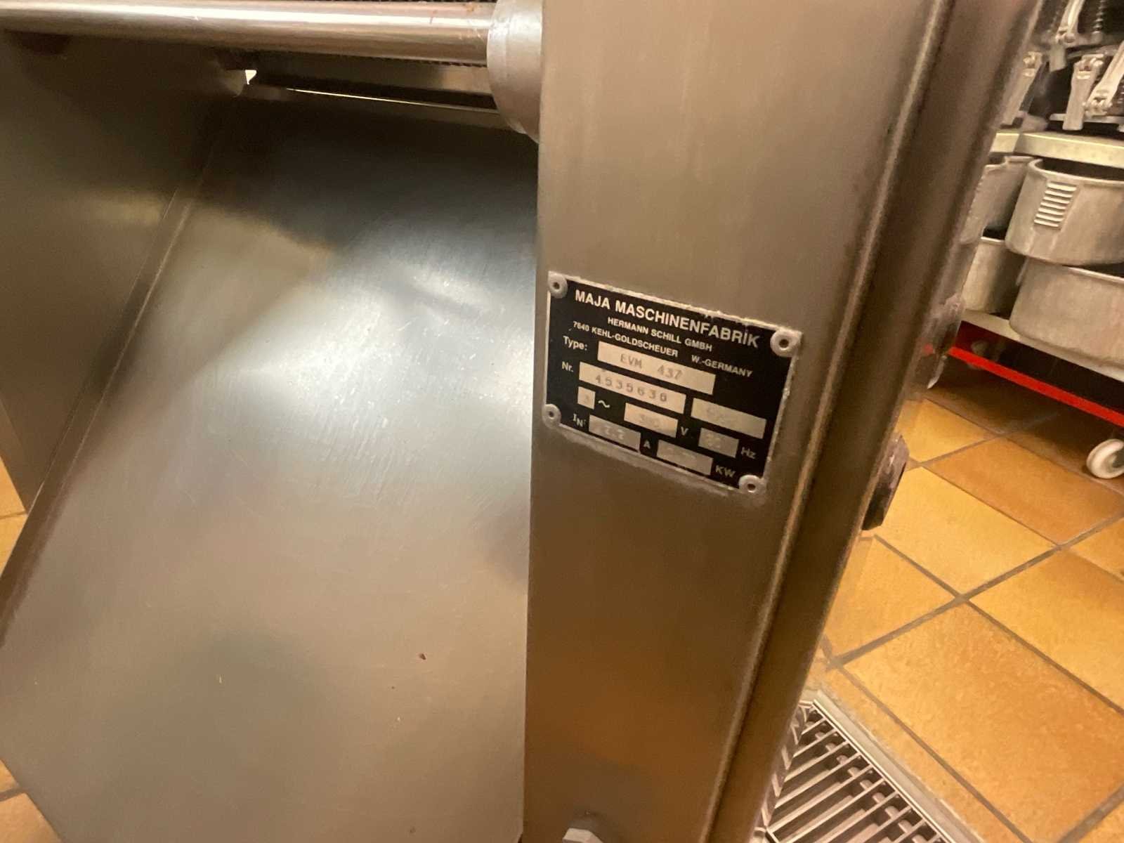 Professionele vleesonthuid- / schilmachine MAJA EVM 437, vervaardigd in Duitsland door MAJA Maschinenfabrik Hermann Schill GmbH. Deze apparatuur is ontworpen om de huid en membranen van stukken vlees (varkensvlees, rundvlees, kalfsvlees, wild, enz.) effectief te verwijderen en tegelijkertijd verliezen te minimaliseren. De robuuste roestvrijstalen constructie garandeert een uitstekende duurzaamheid en optimale hygiëne voor gebruik in de slagerij, snijwerkplaats of voedingsindustrie. No Merk: Maja Type: EVAM 437 Serienummer: 4355636 Aansluiting: 400V