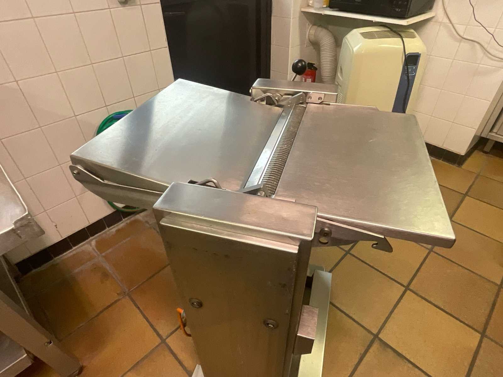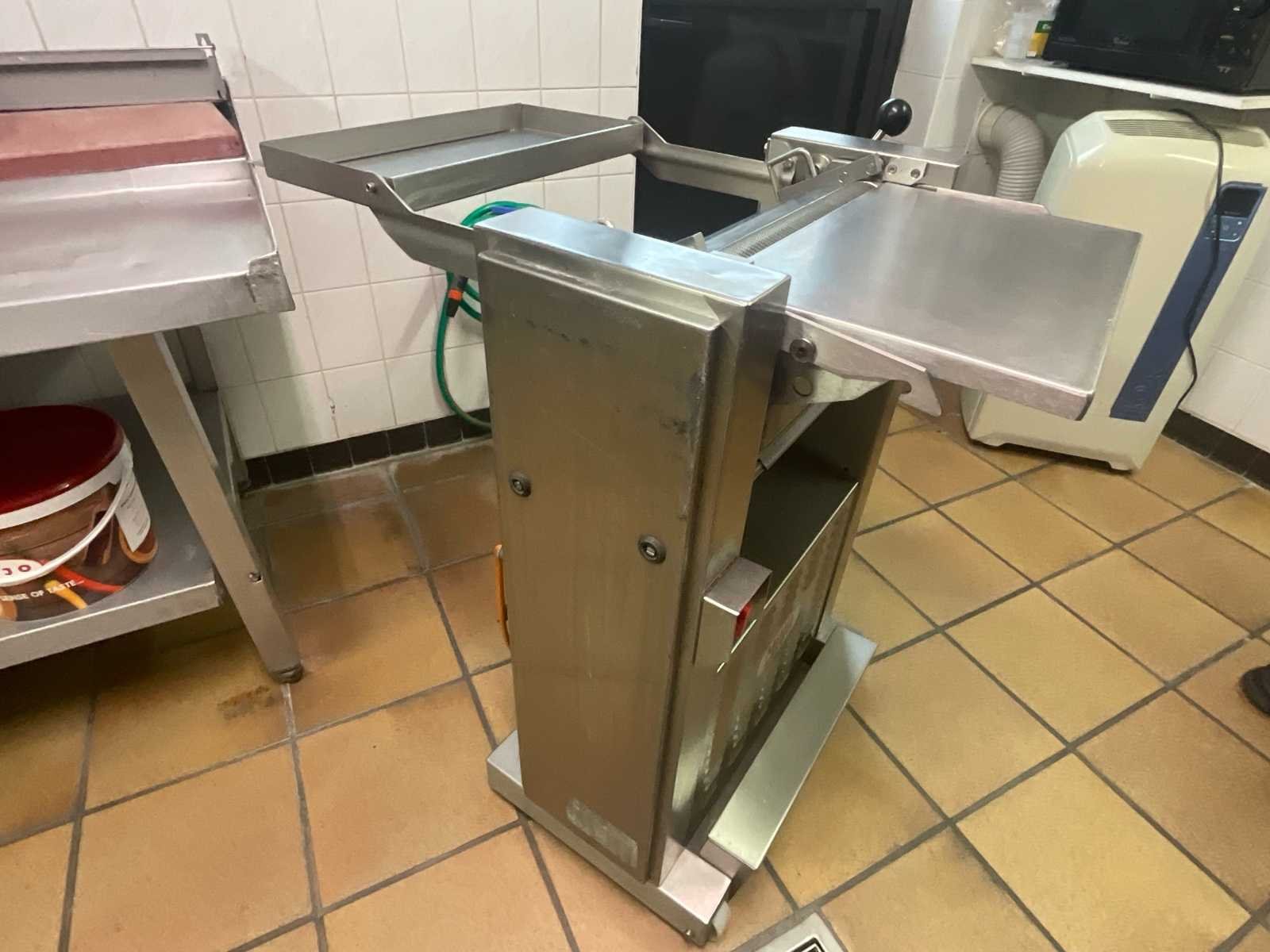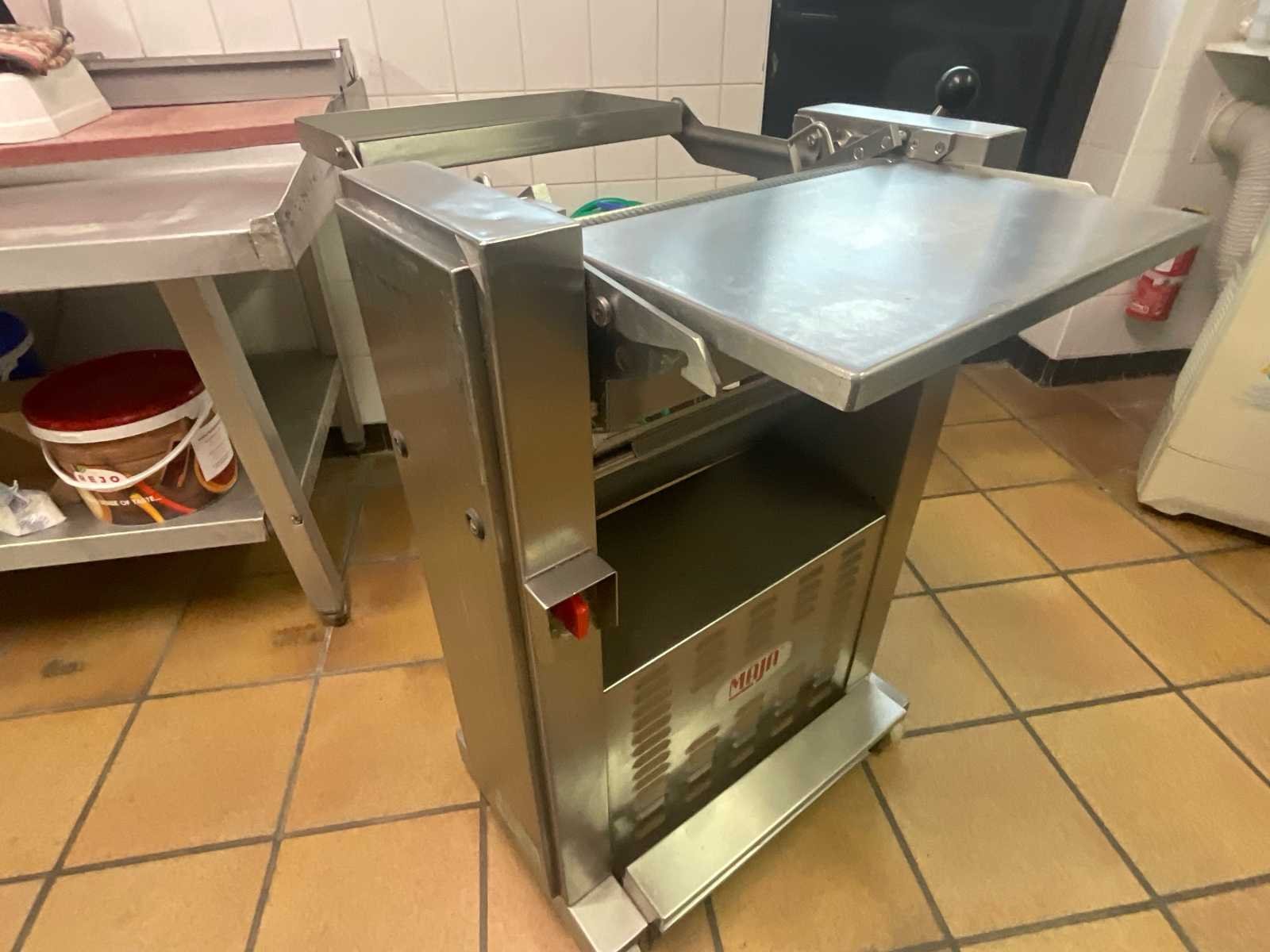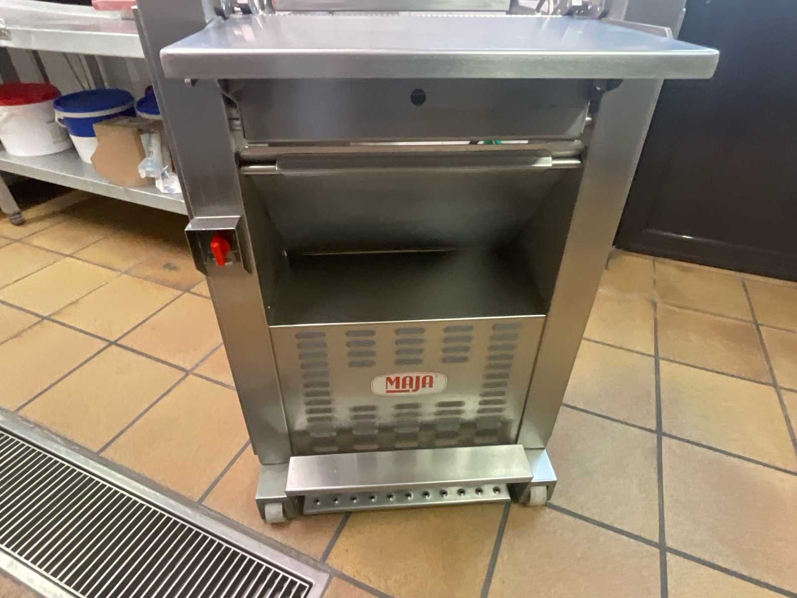 Professionele vleesonthuid- / schilmachine MAJA EVM 437, vervaardigd in Duitsland door MAJA Maschinenfabrik Hermann Schill GmbH. Deze apparatuur is ontworpen om de huid en membranen van stukken vlees (varkensvlees, rundvlees, kalfsvlees, wild, enz.) effectief te verwijderen en tegelijkertijd verliezen te minimaliseren. De robuuste roestvrijstalen constructie garandeert een uitstekende duurzaamheid en optimale hygiëne voor gebruik in de slagerij, snijwerkplaats of voedingsindustrie. No Merk: Maja Type: EVAM 437 Serienummer: 4355636 Aansluiting: 400V