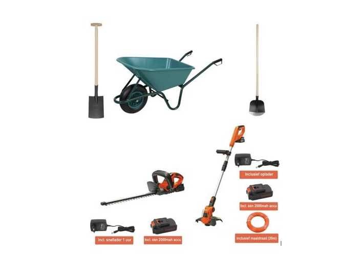 Spade , kruiwagen , heggenschaar & grastrimmer op accu. Nee Merk: Kibani Type: Tuinpakket