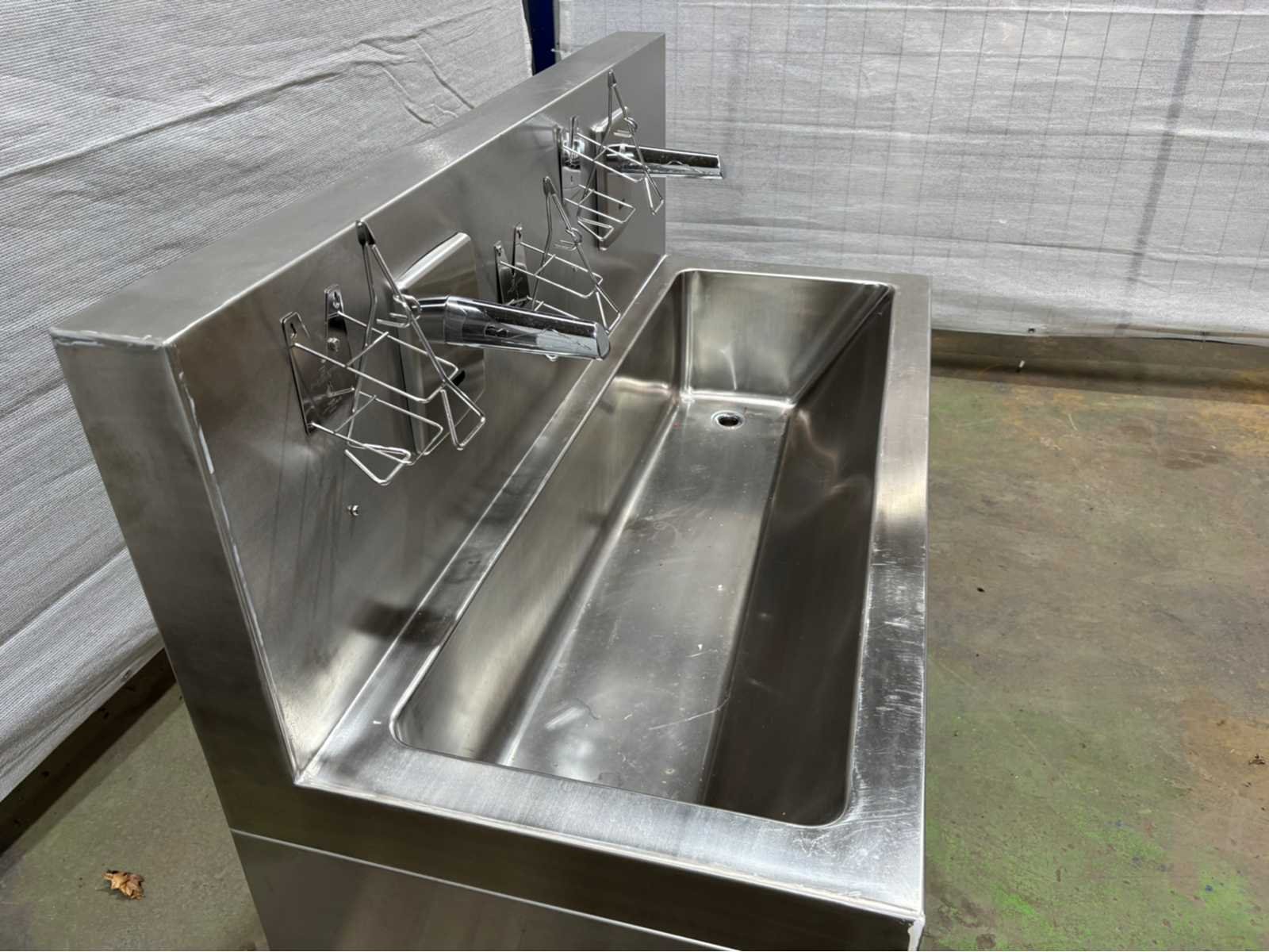 Industriële wasbak inox met automatische kranen - Ophangmodel Nee Merk: Inox Gewicht: 70kg Lengte: 1500cm Breedte: 66cm Hoogte: 50cm Materiaal: Inox