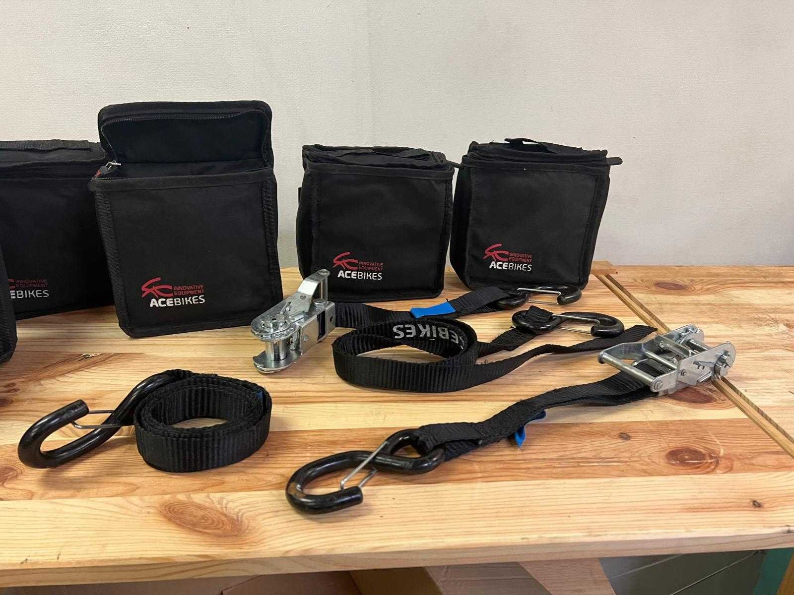 Set van 6 Acebikes spanbandensets met ratelmechanisme, S-haken en opbergtas. Geschikt voor het vastzetten van motorfietsen of scooters tijdens transport. Zwarte kleur, merklogo “Acebikes Innovative Equipment” op de tassen gedrukt. 5 complete sets in originele tassen, nauwelijks gebruikt en in nette staat. 1 set is niet compleet. Nee Merk: Acebikes Type: spanbandenset met ratel en haken