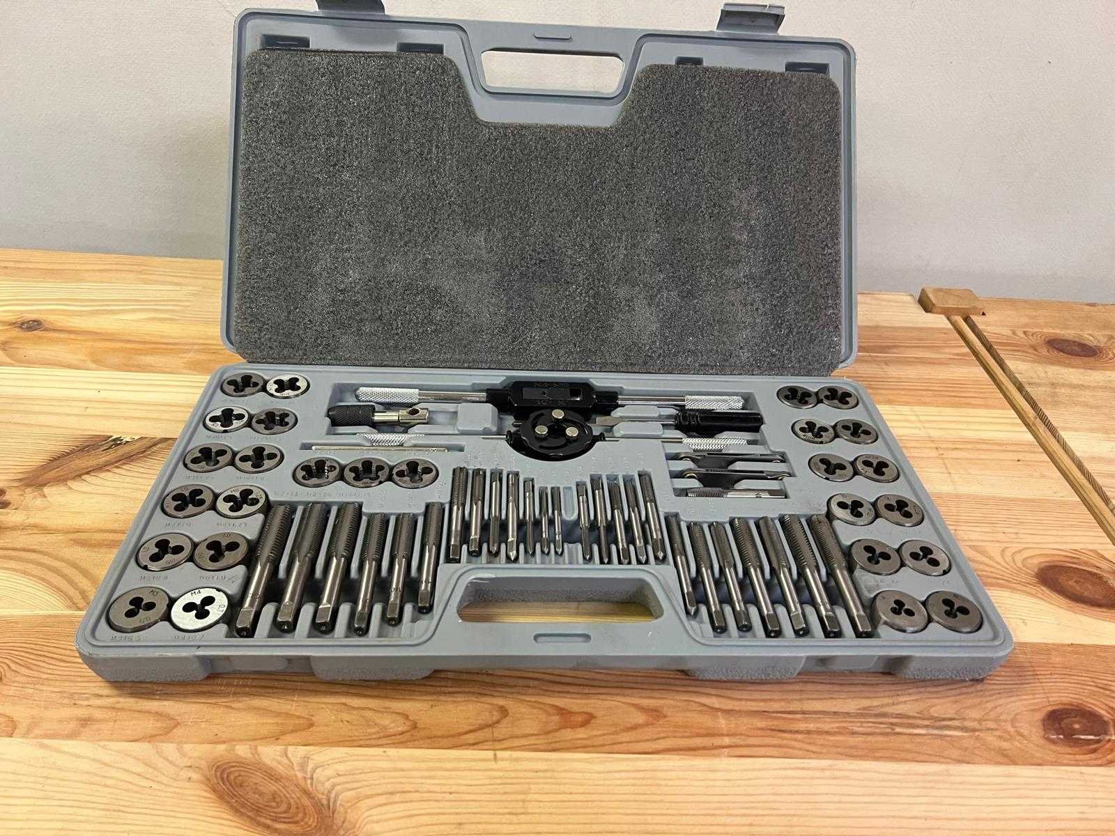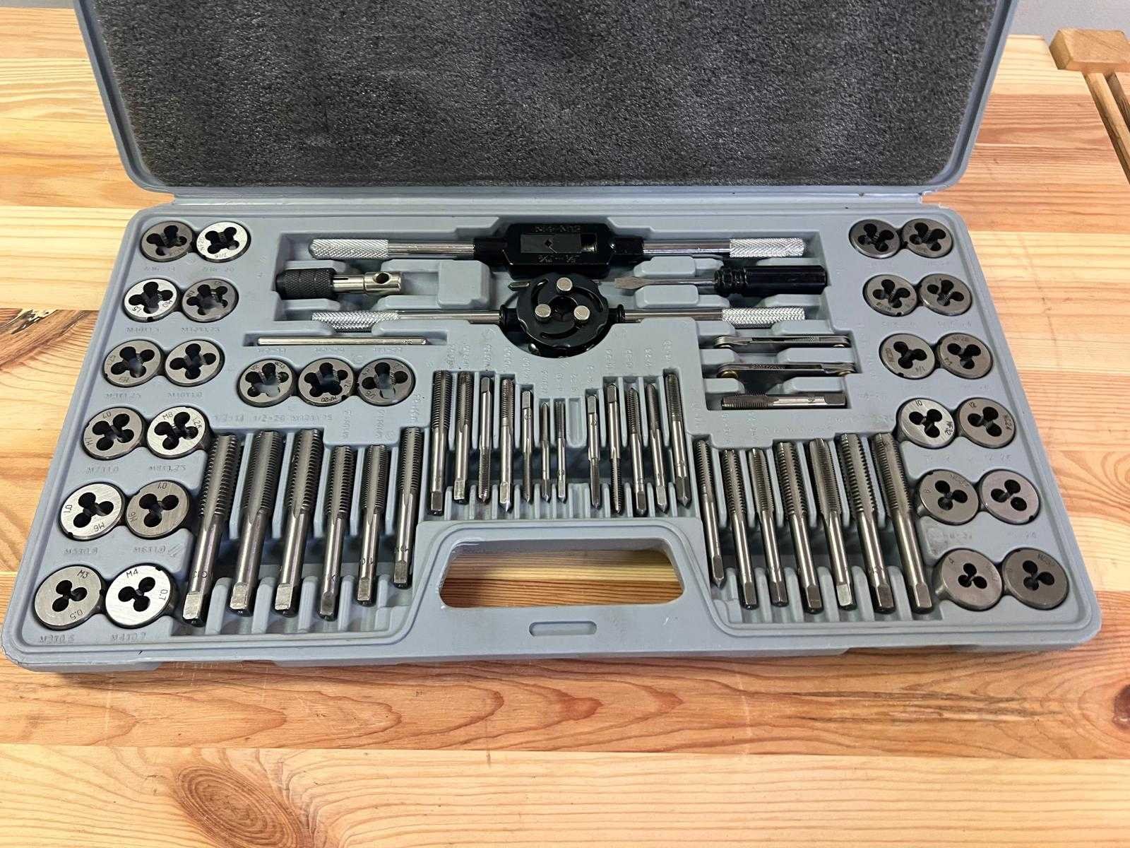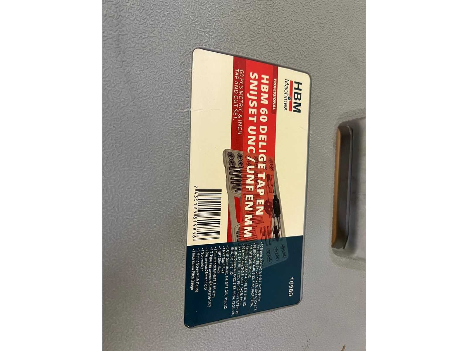 HBM 60-delige tap- en snijset, zowel metrisch als inchmaten (UNC/UNF). Compleet in kunststof opbergkoffer, professioneel gereedschap voor het snijden en herstellen van binnen- en buitendraad. Set oogt volledig en in nette staat, lichte gebruikssporen op de koffer. Nee Merk: HBM Machines