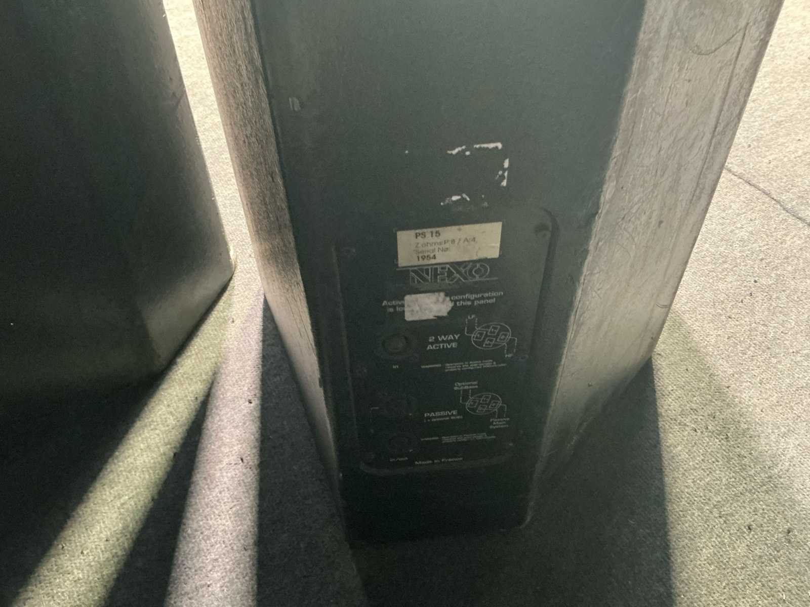 Full-range 2-weg luidspreker 15" woofer (LF) Hoorn / driver: 2" compressordriver Frequenties: 50 Hz – 18 kHz Vermogen (nominaal): ± 600 W RMS (1200 W piek) Gevoeligheid: ca. 100 dB SPL (1 W / 1 m) Maximale SPL: tot 136 dB Configuratie :"2 WAY ACTIVE" of "PASSIVE" via schakelaar Gewicht: ± 34 kg Afmetingen: 680 × 434 × 368 mm. Nee Merk: Nexo Type: PS 15 Capaciteit.: 8O