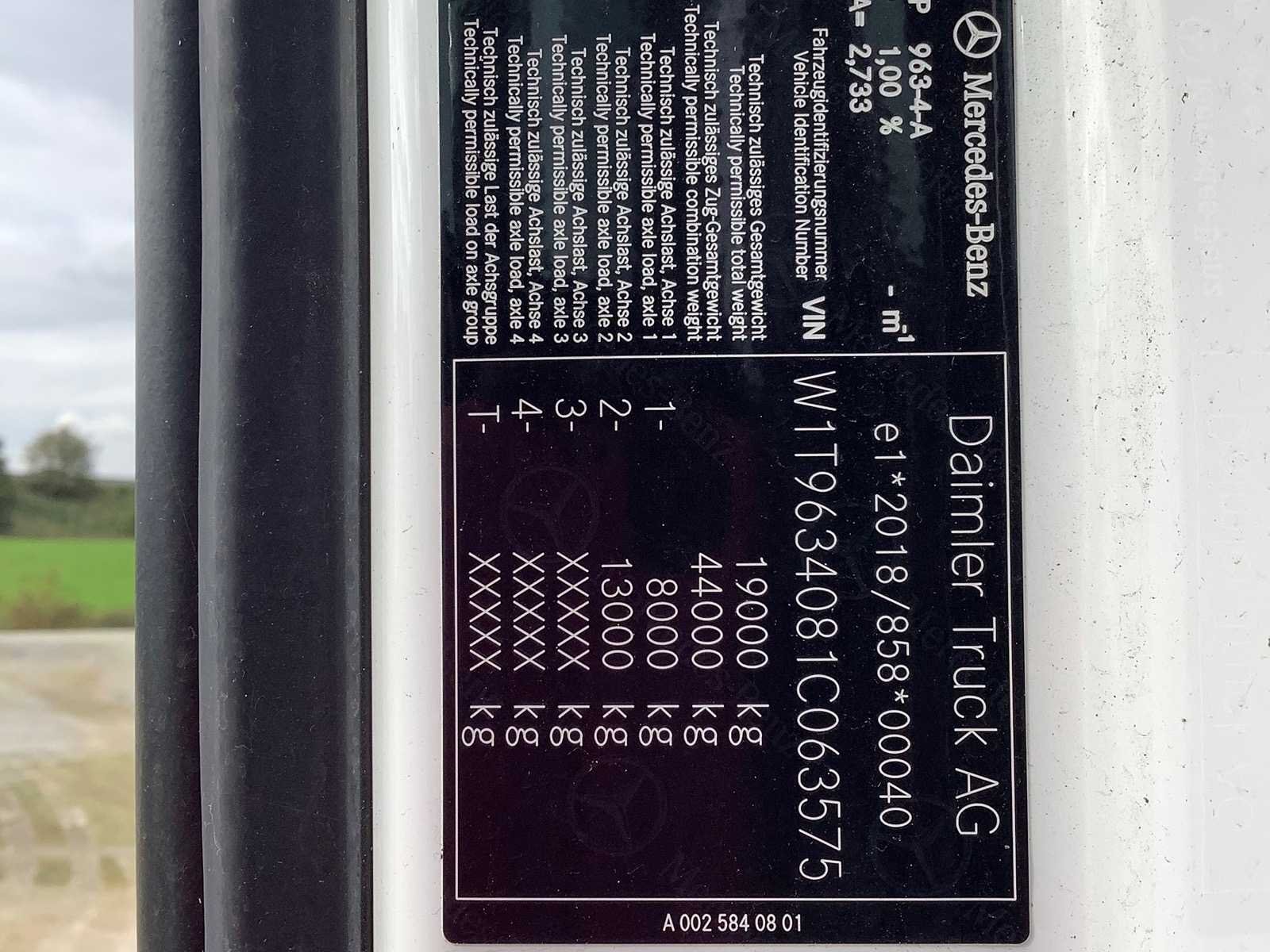 No Merk: Mercedes-Benz Type: Actros 963-4-A Bouwjaar: 2023 Chassisnummer VIN: W1T9634081C063575 Cilinderinhoud: 12809cc APK vervaldatum: 17/11/2024 Datum eerste toelating: 14/11/2023 Type transmissie: Automatisch Aantal assen: 2 Fuel Type: Diesel Laadvermogen: 19000kg Aantal sleutels: 1 Emissieklasse: Euro 6 Slaapcabine: true Eigen gewicht: 8412kg Totale afmeting L: 6308mm Totale afmeting Breedte: 2500mm Totale afmeting Hoogte: 3963mm Afgelezen kilometerstand: 146374km Nationaliteit documenten: Belgische Aantal zitplaatsen: 2 Automaat: true Diesel: true