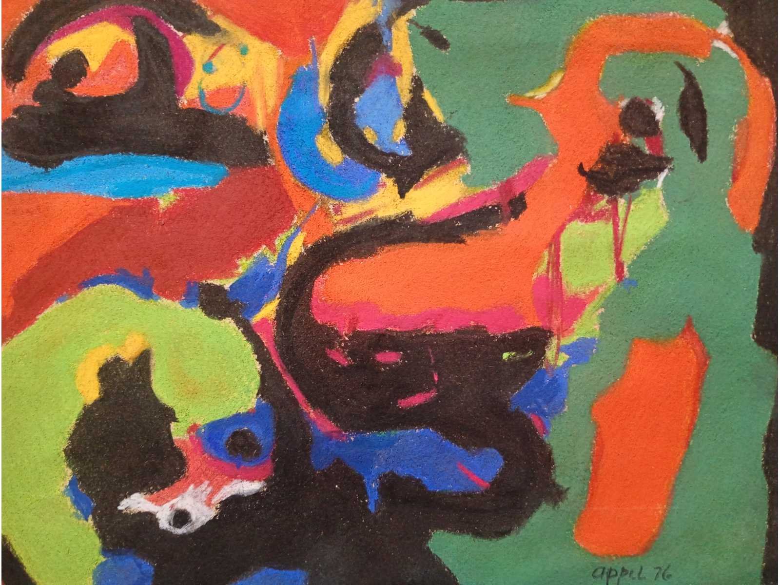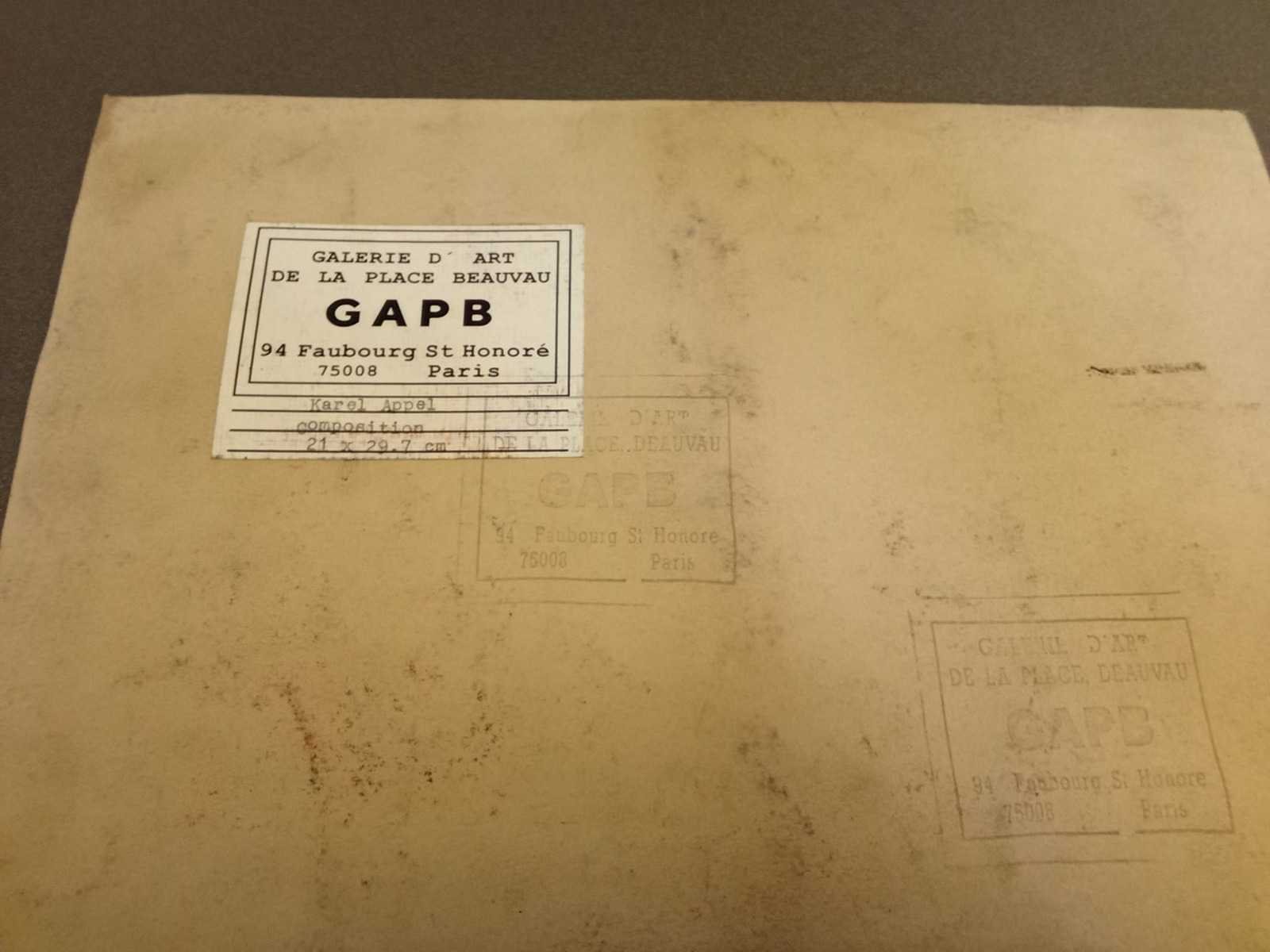 Compositie getekend K.Appel klein werkje afmetingen c.a. 21X29 cm. Stempels parijse gallerij op de achterzijde. Werk naar Karel Appel No Kunstenaar: Appel K. Land: Nederland Materiaal: papier Handtekening/oplage: true Hoogte: 29cm Breedte: 21cm