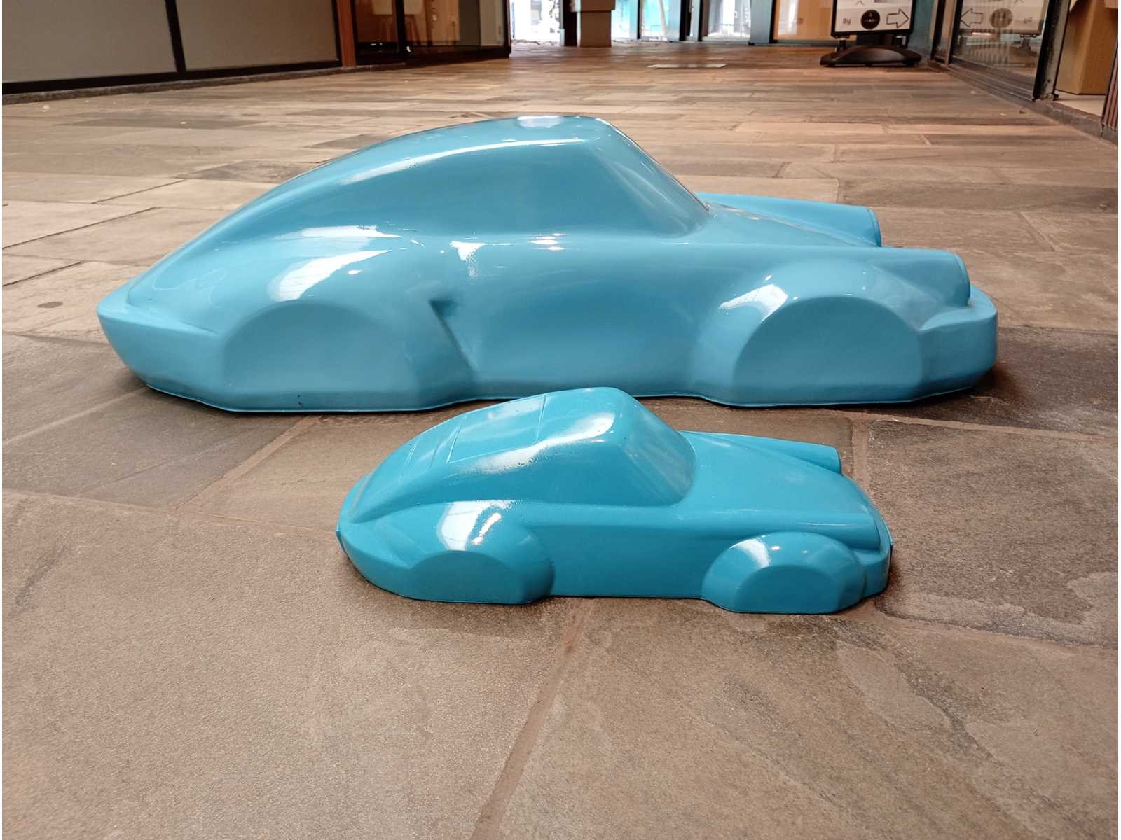 Set van twee sculpturen, met de hand beschilderd. Sculpturen zijn gegeoten uit poleyster. Kunnen als blikvanger op een kast worden geplaatst of tegen de muur. Het grote model is 90cm lang, het kleine model 35cm. De Porsche 964 geldt als een van de meest iconische sportwagens uit de geschiedenis van het merk Porsche. Geproduceerd tussen 1989 en 1994, vertegenwoordigt dit model een overgangsperiode: klassiek in zijn silhouet, maar vernieuwend door de introductie van moderne technologieën zoals ABS, stuurbekrachtiging en vierwielaandrijving. De sculptuur van de Porsche 964 is niet enkel een object, maar een artistieke interpretatie van een ontwerpicoon. Dit document beschrijft het concept, de materialen, het productieproces en de esthetische waarde van dit kunstobject. Doelstelling De sculptuur beoogt de essentie van de Porsche 964 te vangen in een driedimensionale kunstvorm. Het object is ontworpen om niet enkel de vorm, maar ook de emotie en tijdsgeest van de originele wagen uit te dragen. Het dient als verzamelobject, kunstwerk en cultureel statement. Concept & Vormgeving De sculptuur is een gestileerde representatie van de Porsche 964. Belangrijke kenmerken die behouden zijn: De ronde koplampen en vloeiende motorkap. De kenmerkende wielkasten met hun robuuste ronding. Het achterste silhouet No Materiaal: Resin