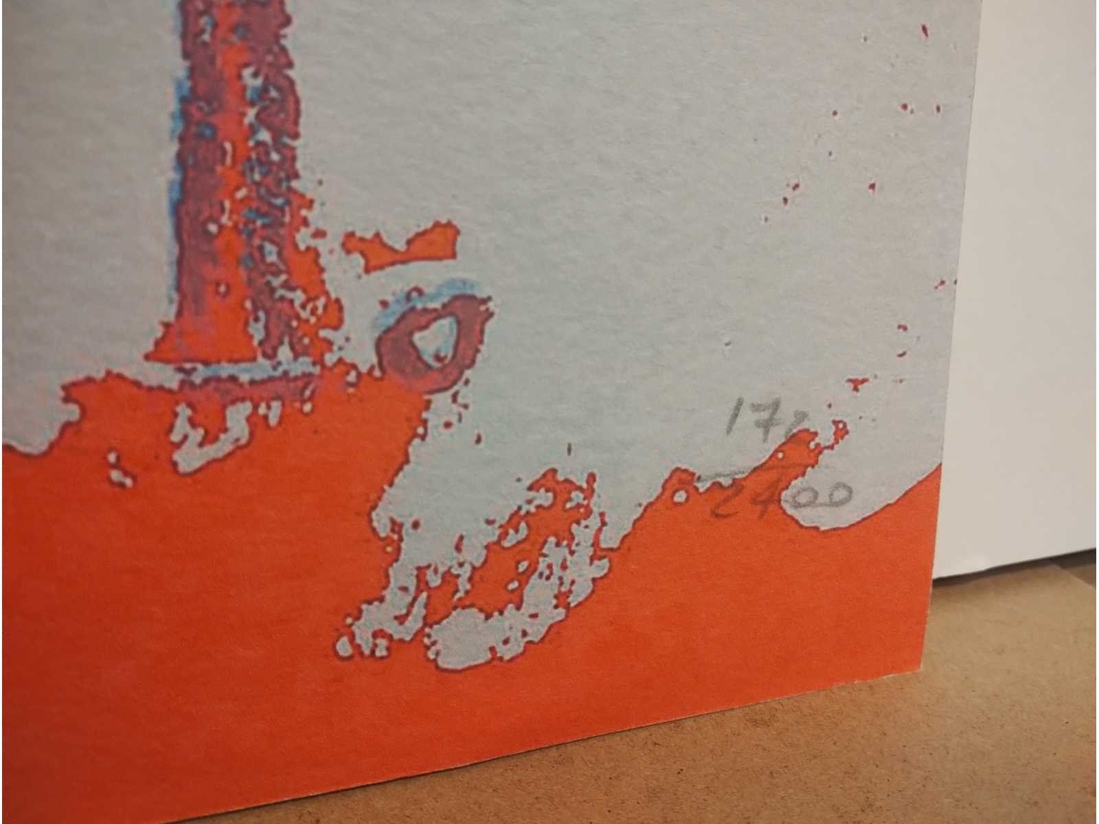 Andy Warhol Offsetlithografie / Getekend in de plaat / Afmeting : 60x60cm / Blinddrukstempel / Zonder Certificaat. Oplage 2400 exemplaren. Andy Warhol (oorspronkelijke naam Andrew Warhol, 6 augustus 1928 Pittsburgh, Pennsylvania, VS - 22 februari 1987, New York, New York, VS) was een Amerikaanse schilder, graficus, filmmaker en leider van de Amerikaanse pop-artbeweging. Hij begon zijn carrière als illustrator van promotieartikelen. Later werd hij over de hele wereld bekend als schilder, regisseur van avant-gardefilms en manager van de rockband The Velvet Underground. Hij is te zien in verschillende biografische en documentaire films over hem. In 1991 werd in Medzilaborce, in de buurt van de geboorteplaats van zijn ouders, een museum geopend dat aan zijn werk is gewijd. Drie jaar later werd in zijn geboorteland Pittsburgh nog een museum geopend. No Kunstenaar: Andy Warhol Land: America Regio: Pensilvania Titel van werk: Macintosh Techniek: offset litho Materiaal: papier Handtekening/oplage: true Oplage: 2400 ex