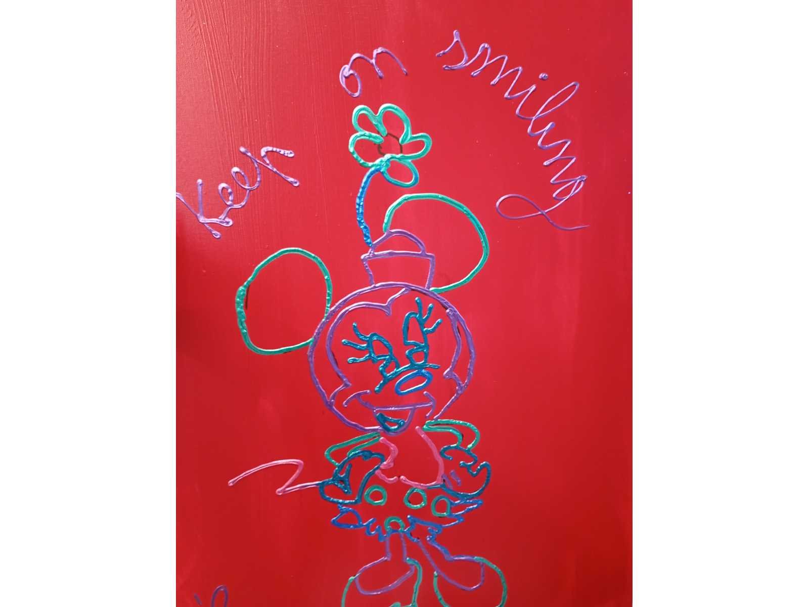 Hannes D'haeseMinie Mouse 50x70 cm. Uniek exemplaar. Hannes D’Haese is het tegenovergestelde van de klassiek geschoolde artiest. Geïnspireerd door Karel Appel is D’Haese beginnen schilderen toen hij in aanraking kwam met de kunst en de kleuren van de Nederlander. Net als deze beroemde Cobra artiest die beweerde “enkel wat verf op een doek te gooien”, verkondigt D’Haese dat hij nog nooit een kunstacademie van binnen heeft gezien; waarmee hij benadrukt dat je geen artiest kunt worden, maar dat artiest zijn in je moet zitten. Zijn droombeelden, daar draait het voor hem om, technieken en scholing werken te beperkend. No Kunstenaar: D'Haese hannes Land: belgie Regio: Knokke Titel van werk: Keep on Smilling Techniek: acryl Materiaal: canvas Handtekening/oplage: true Oplage: 1/1uniek exemplaar Gesigneerd: signed Hoogte: 70cm Breedte: 50cm