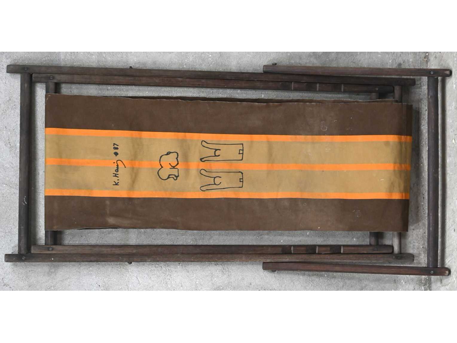 Een strandstoel met hierop 3 figuren, draagt handtekening en datum. Toegeschreven aan Keith Haring. No Kunstenaar: Keith Haring (after) Land: amerika Regio: NY Titel van werk: Strandstoel Keith Haring Knokke Techniek: viltstift Materiaal: strandstoel