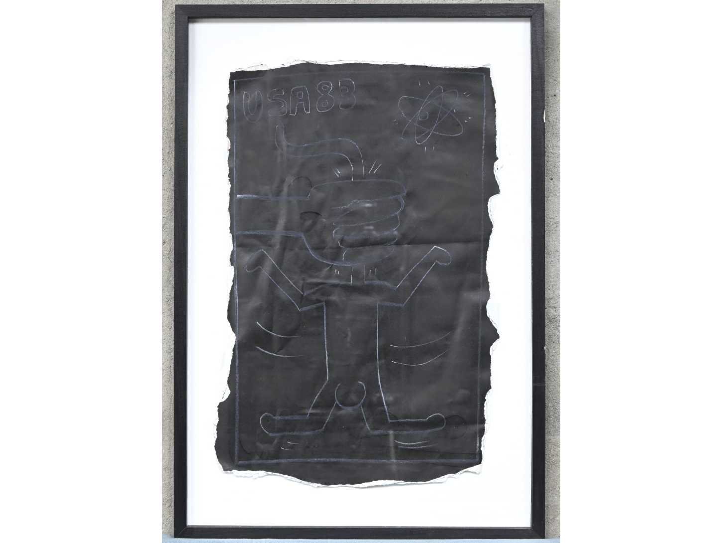 NY SUBWAY kalktekening op zwart mat papier. Keith Haring (after) subway drawing. Zeer groot uniek werk. Keith Haring merkte op dat de lege advertentieruimtes van de New York City-metro bedekt waren met mat zwart papier toen de advertentie-abonnementen afliepen. Hij kocht meteen wat krijt en begon te tekenen. In de daaropvolgende vijf jaar werd dit een dagelijkse, repetitieve obsessie. Zijn metro tekeningen behoren tot zijn bekendste en meest gevierde werk. Provenance: Gallerij uit Sint-Martens Lathem No Kunstenaar: Keith Haring Land: Amerika Regio: NY