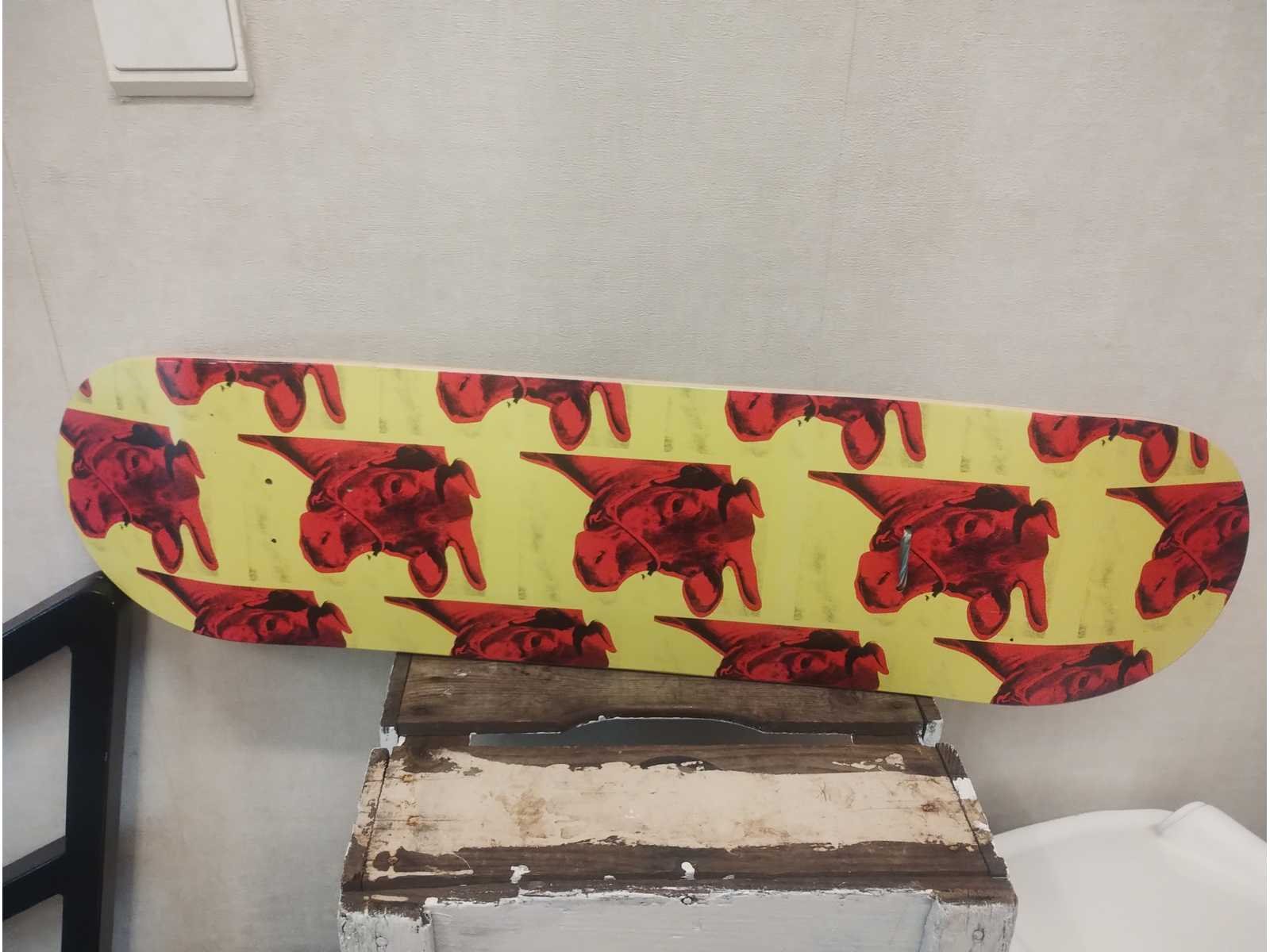 Skateboard dek, zeer mooi voor montage aan de muur. Andy Warhols Cow Wallpaper was de eerste in een reeks behangontwerpen die hij tussen de jaren zestig en tachtig maakte. Volgens Warhol kwam de inspiratie voor het werk van kunsthandelaar Ivan Karp, die de kunstenaar aanmoedigde om het pastorale beeld van een koe te verkennen. Het behang, gekleurd in fel roze en geel, verscheen meteen op de shows van Warhol en werd overal op de muren van de galerie geplakt. Koe (roze en geel) – skateboardkunsteditie onder licentie uitgegeven onder goedkeuring van de andy warhol foundation. No