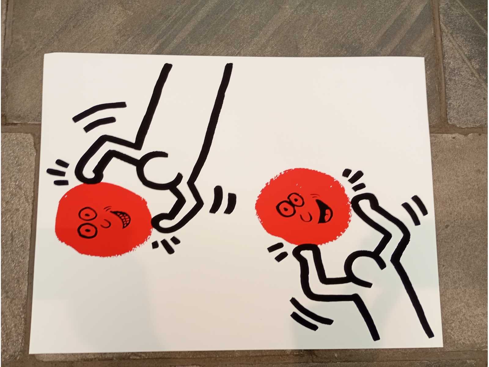 K. Haring lithografie. Voor de reeks Red and Blue gebruikte Keith Haring enkel blauw en rood om op een essentiële en doordachte manier zijn compositie samen te stellen. Lithografie, niet genummerd op achterzijde voorzien van stempel foundation. Afmetingen ca. 42 x 56cm No Kunstenaar: Keith Haring Land: USA Hoogte: 56cm Breedte: 42cm