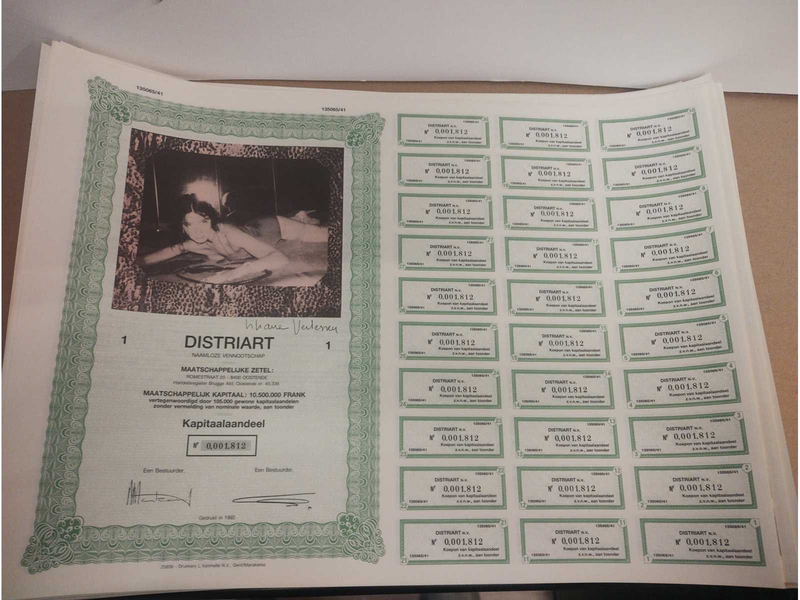 Werk speciaal vervaardigd voor dit aandeel Genummerd aandeel met coupon gesigneerd in de druk. Titel; Distriart Belgie Uitgever; Distriart n.v. Galerie Forum, Oosteinde 1987 Oorspronkelijk zouden er 1000 aandelen worden uitgegeven door 100 kunstenaars. De oplage werd uiteindelijk slechts 16 exemplaren. No Kunstenaar: Distr-ARt Hoogte: 44cm Breedte: 32cm