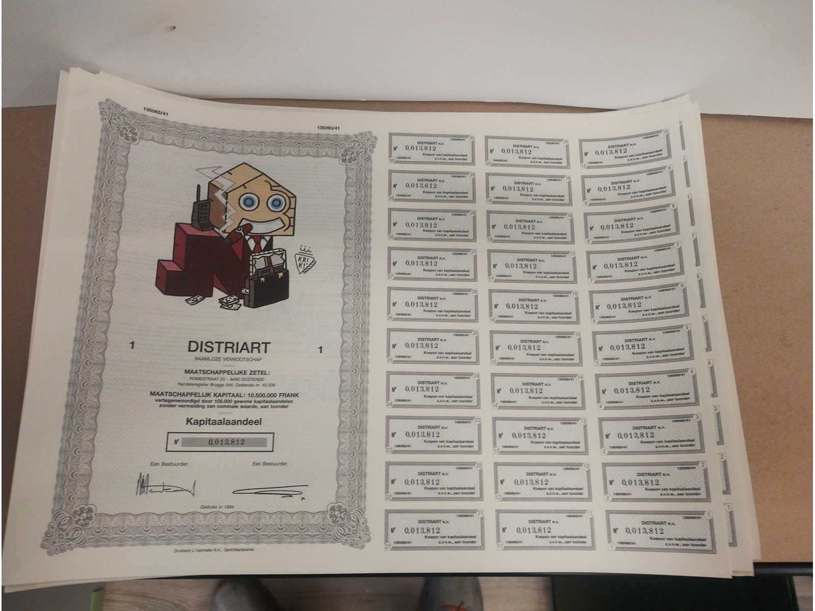 KriKri, christian Vallee Werk speciaal vervaardigd voor dit aandeel Genummerd aandeel met coupon gesigneerd in de druk. Titel; Distriart Belgie Uitgever; Distriart n.v. Galerie Forum, Oosteinde 1987 Oorspronkelijk zouden er 1000 aandelen worden uitgegeven door 100 kunstenaars. De oplage werd uiteindelijk slechts 16 exemplaren. No Kunstenaar: Distri Art Hoogte: 44cm Breedte: 32cm