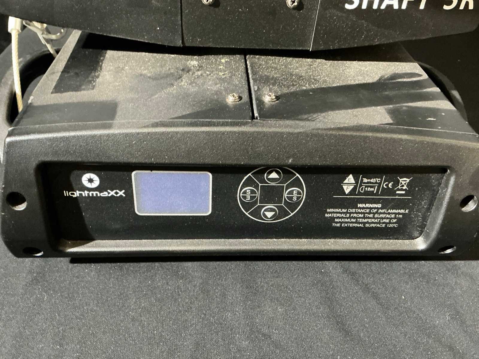 Niet getest No Merk: Lightmaxx Type: Shaft 5R DMX: true Met flightcase: true Aansluiting: 230V