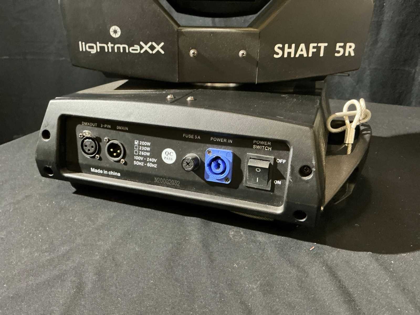 Niet getest No Merk: Lightmaxx Type: Shaft 5R DMX: true Met flightcase: true Aansluiting: 230V