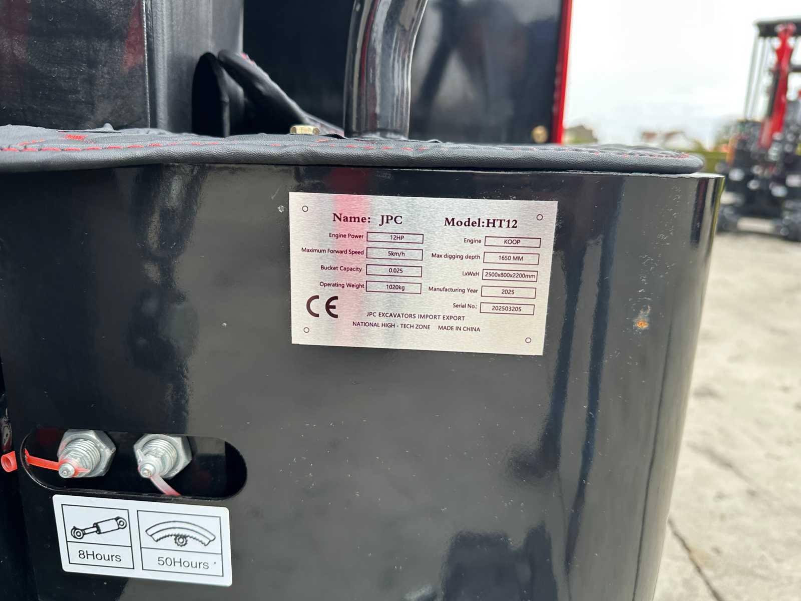 Hamerleidingen Duwblad Tandenbak Nieuw Nee Merk: JPC Type: HT12 Bouwjaar: 2025 Serienummer: 202503205 Merk motor: Koop Aantal cilinders: 1 Brandstof: Diesel Graafbak afm. b: 300mm Rups breedte: 180mm Afgelezen urenstand: 0 Eigen gewicht: 1020kg Totale afmeting L: 2500mm Totale afmeting Breedte: 950mm Totale afmeting Hoogte: 2200mm