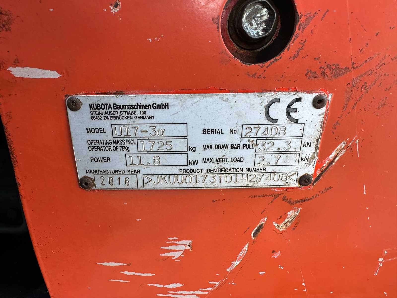 Hamerleidingen Hydraulisch verstelbare onderwagen. Duwblad Geen documenten Nee Merk: Kubota Type: U17-3 Bouwjaar: 2016 Serienummer: JKUU0173T01H27408 Merk motor: Kubota Motorvermogen (kW): 11.8kW Aantal cilinders: 4 Brandstof: Diesel Bedrijfsgewicht: 1725kg Graafbak afm. b: 1000mm Afgelezen urenstand: 2079 Totale afmeting L: 4000mm Totale afmeting Breedte: 1250mm Totale afmeting Hoogte: 2270mm GS Code: 8429521200