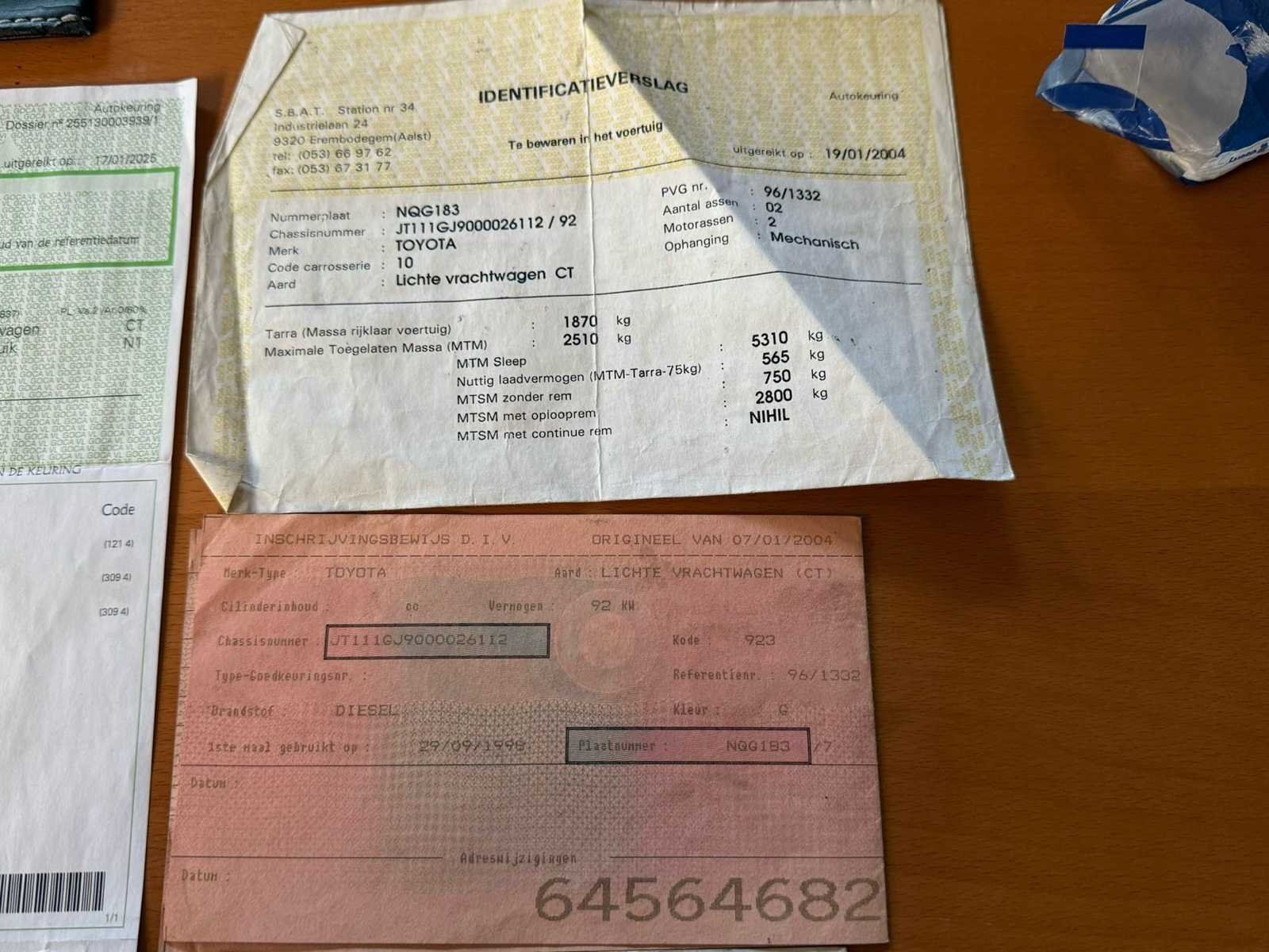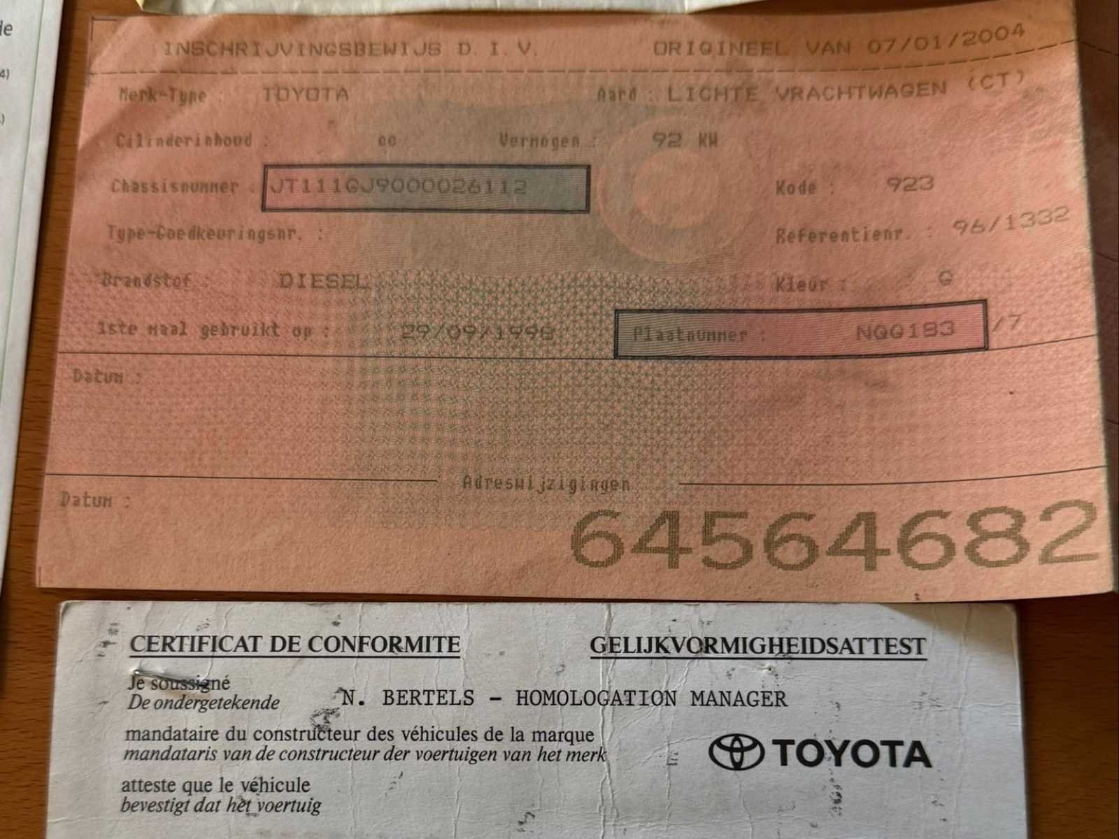 No Merk: Toyota Type: Land Cruiser Bouwjaar: 1998 Chassisnummer: QJT111GJ9000026112 Afgelezen kilometerstand: 238129 Brandstof: Diesel Datum eerste inschrijving: 29/09/1998 Boorddocumenten aanwezig?: true Nationaliteit documenten: België Kentekenpapieren compleet?: true Transmissie: Manueel Vermogen (kW): 92kW Aantal deuren: 3 Aantal zitplaatsen: 2 Kleur: Rood Cilinderinhoud: 3000 Inschrijvingsbewijs - deel 1 : Aanwezig Inschrijvingsbewijs - deel 2: Aanwezig Gelijkvormigheidsattest aanwezig: true