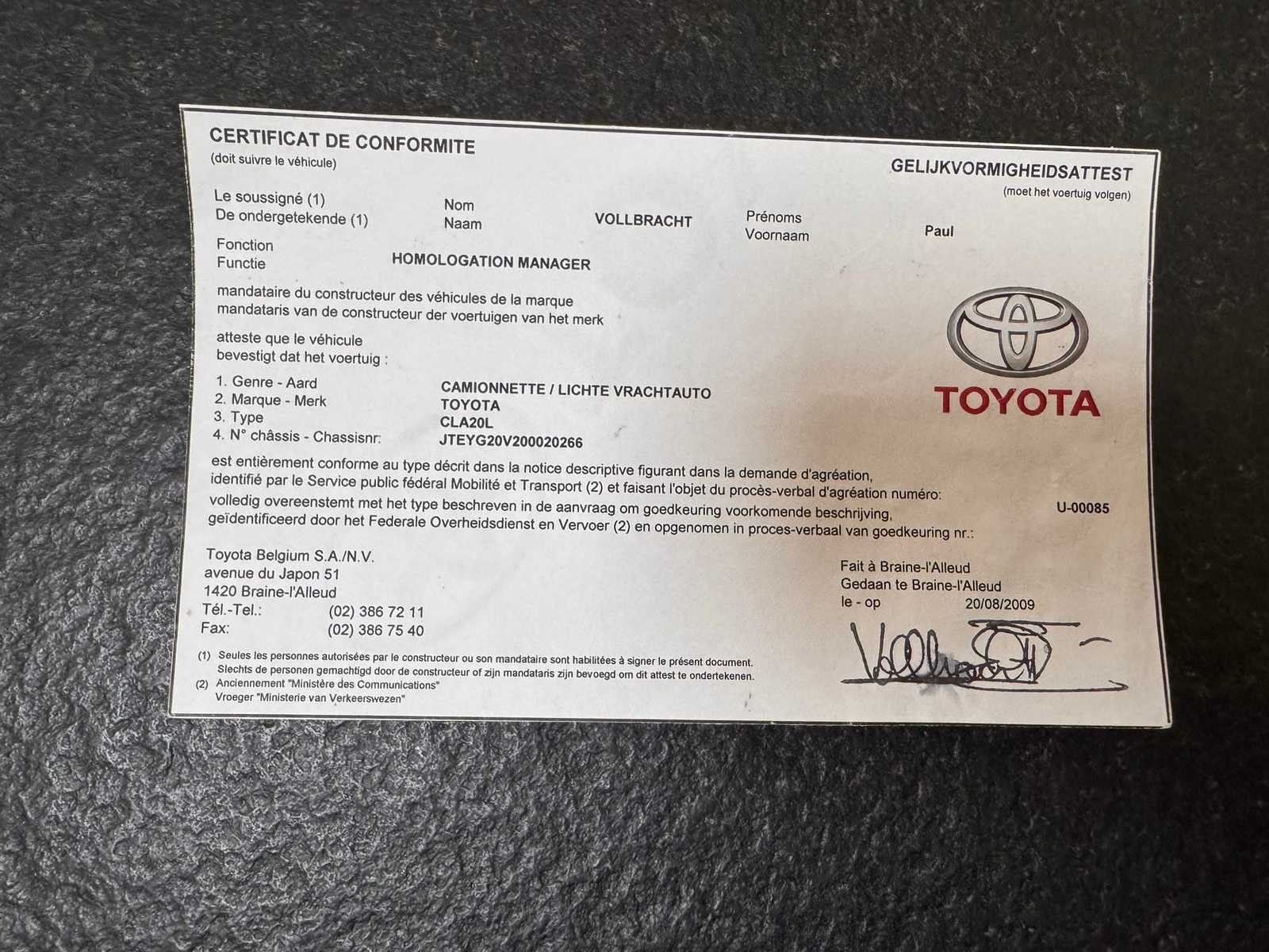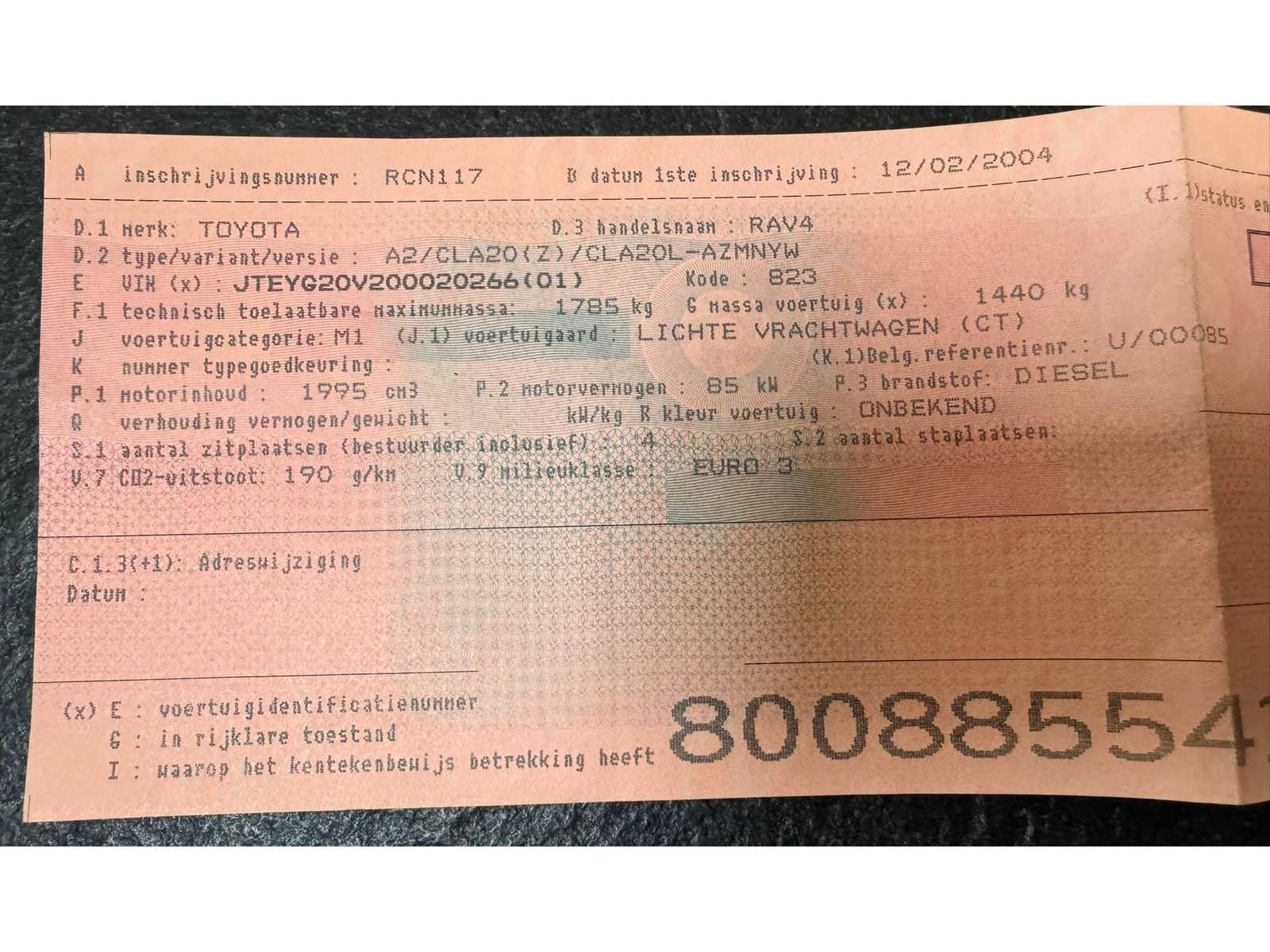 De wagen start en rijdt zonder problemen. De wagen is een lichte vracht. Nee Merk: Toyota Bouwjaar: 2004 Afgelezen kilometerstand: 160000km Cilinderinhoud: 1995cc Vermogen (kW): 85kW Brandstof: Diesel Chassisnummer: JTEYG20V200020266 Datum eerste toelating: 12/02/2004 Kleur: Grijs Transmissie: Handgeschakeld Emissieklasse: Euro 3 Nationaliteit documenten: België Start en rijdt: Ja Vavato voert geen technische keuring uit.: true Inschrijvingsbewijs - deel 1 : Aanwezig