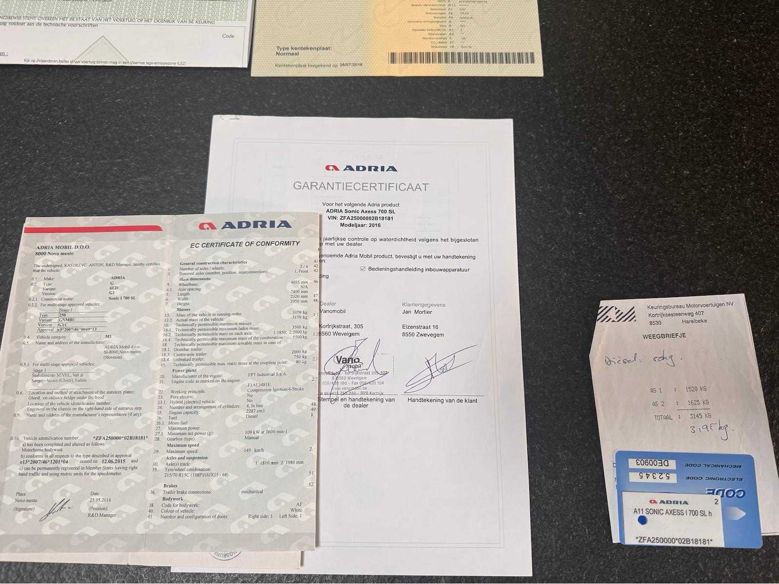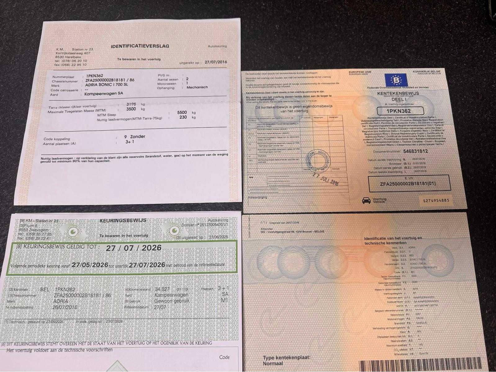 Nee Merk: Adria Model: Sonic l 700 SL Chassisnummer: ZFA25000002B18181 Aantal zitplaatsen: 4 Transmissie: Manueel Datum eerste toelating: 26/07/2016 Bouwjaar: 2016 Afgelezen kilometerstand: 37016km Vermogen (kW): 109kW Cilinderinhoud: 2287cc Emissieklasse: Euro 5b Brandstof: Diesel