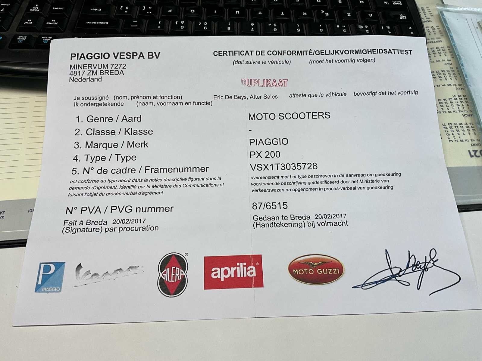 Compleet met keuring voor verkoop en 1 jaar garantie. No Merk: Vespa Model: PX200?E Brandstof: Benzine Chassisnummer: VSX1T3035728 Cilinderinhoud: 198cc Datum eerste toelating: 19/06/1995 Vermogen (kW): 9kW Afgelezen kilometerstand: 14106km Nationaliteit documenten: Belgisch Aantal sleutels: 2 Startinformatie: Start en rijdt Bouwjaar: 1995