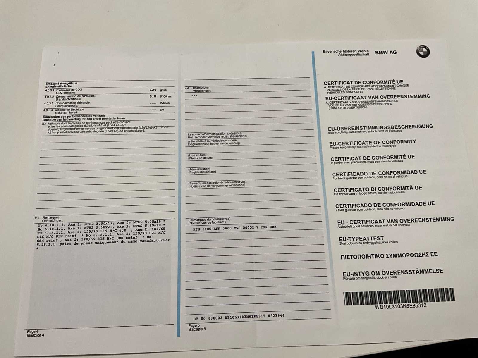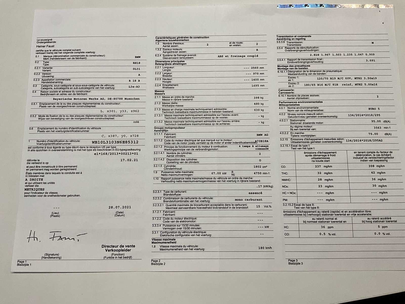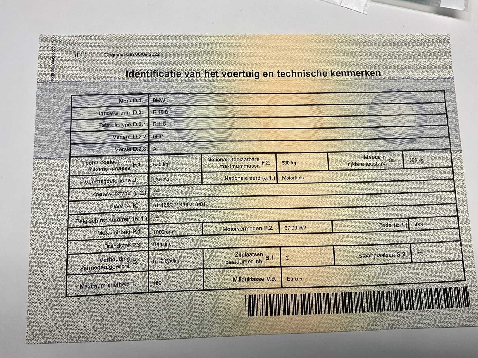 Compleet met keuring voor verkoop en 2 jaar garantie. 0134 Adaptieve koplampen 017C Tankdeckel abschliessbar 0202 Dagrijlicht 0204 Hill Start Control 0219 Deluxe Headlight 035A Designoptie chroom 035B Belijning 036A Treeplank 0382 Handleiding Frans 0386 Handleiding nederlands 0395 Radio 0417 Centrale vergrendeling 047B Edition 0518 Stoelverwarming 0530 Bandenspanningscontrole 05AA Achteruitrijhulp 05DF ACC 0603 diefstalbeveiligingssysteem 064A Marshall Gold Series Stage 1 06AC Intelligente noodoproep 06AE Teleservices No Merk: BMW Model: R 18 B Brandstof: Benzine Chassisnummer: WB10L3103N6E85312 Cilinderinhoud: 1802cc Vermogen (kW): 67kW Nationaliteit documenten: Belgisch Aantal sleutels: 2 Startinformatie: Start en rijdt