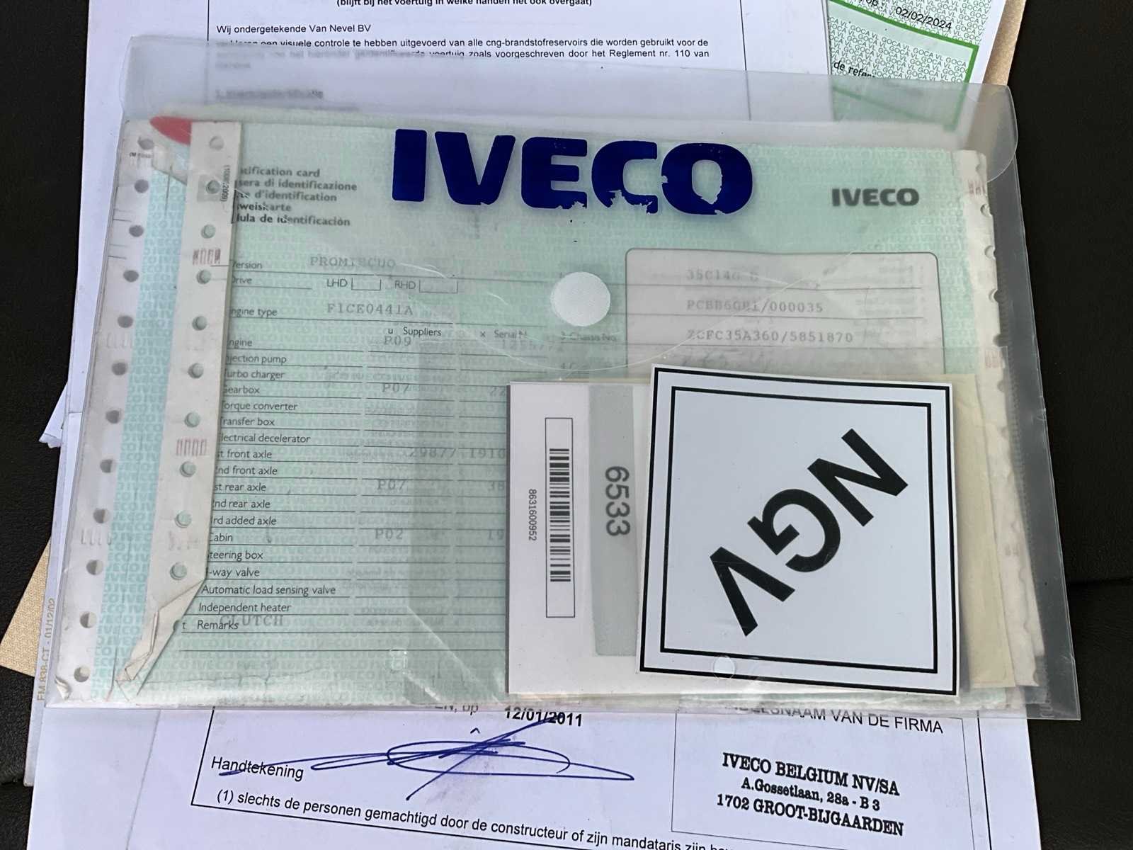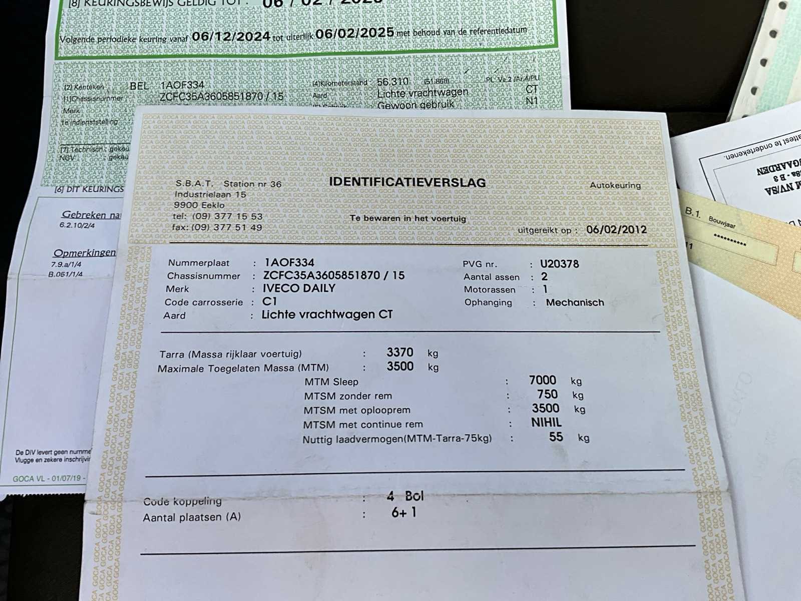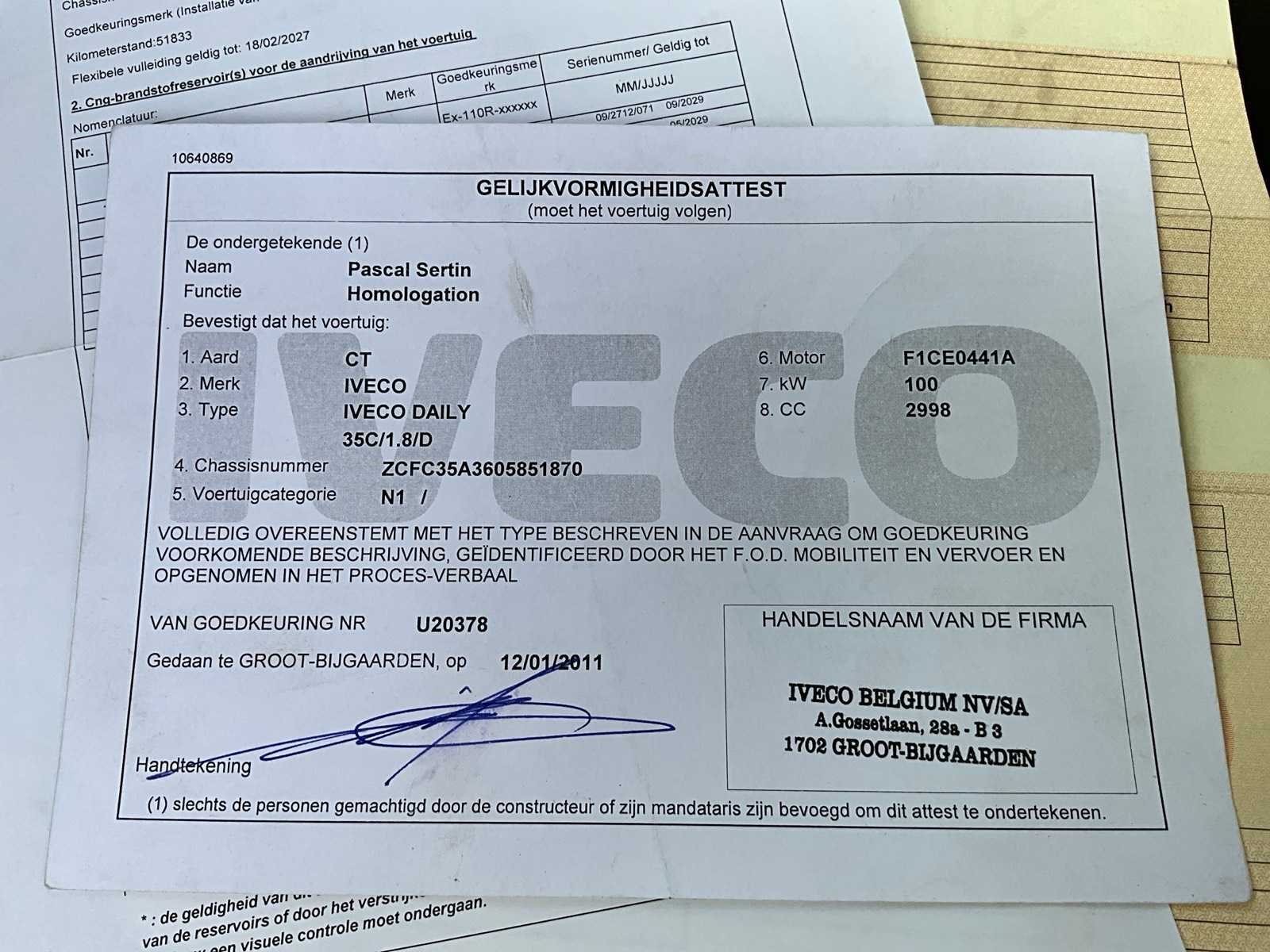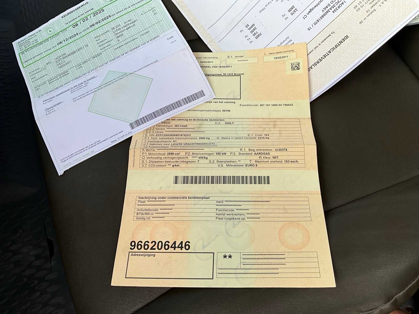 Nee Merk: Iveco Model: Daily 3.0 Bouwjaar: 2011 Afgelezen kilometerstand: 59676km Cilinderinhoud: 2998cc Vermogen (kW): 100kW Brandstof: Benzine + CNG Chassisnummer: ZCFC35A3605851870 Datum eerste toelating: 18/12/2011 Transmissie: Handgeschakeld Nationaliteit documenten: Belgisch Start en rijdt: Ja startinformatie : Start en rijdt Inschrijvingsbewijs - deel 1 : Aanwezig Inschrijvingsbewijs - deel 2: Aanwezig