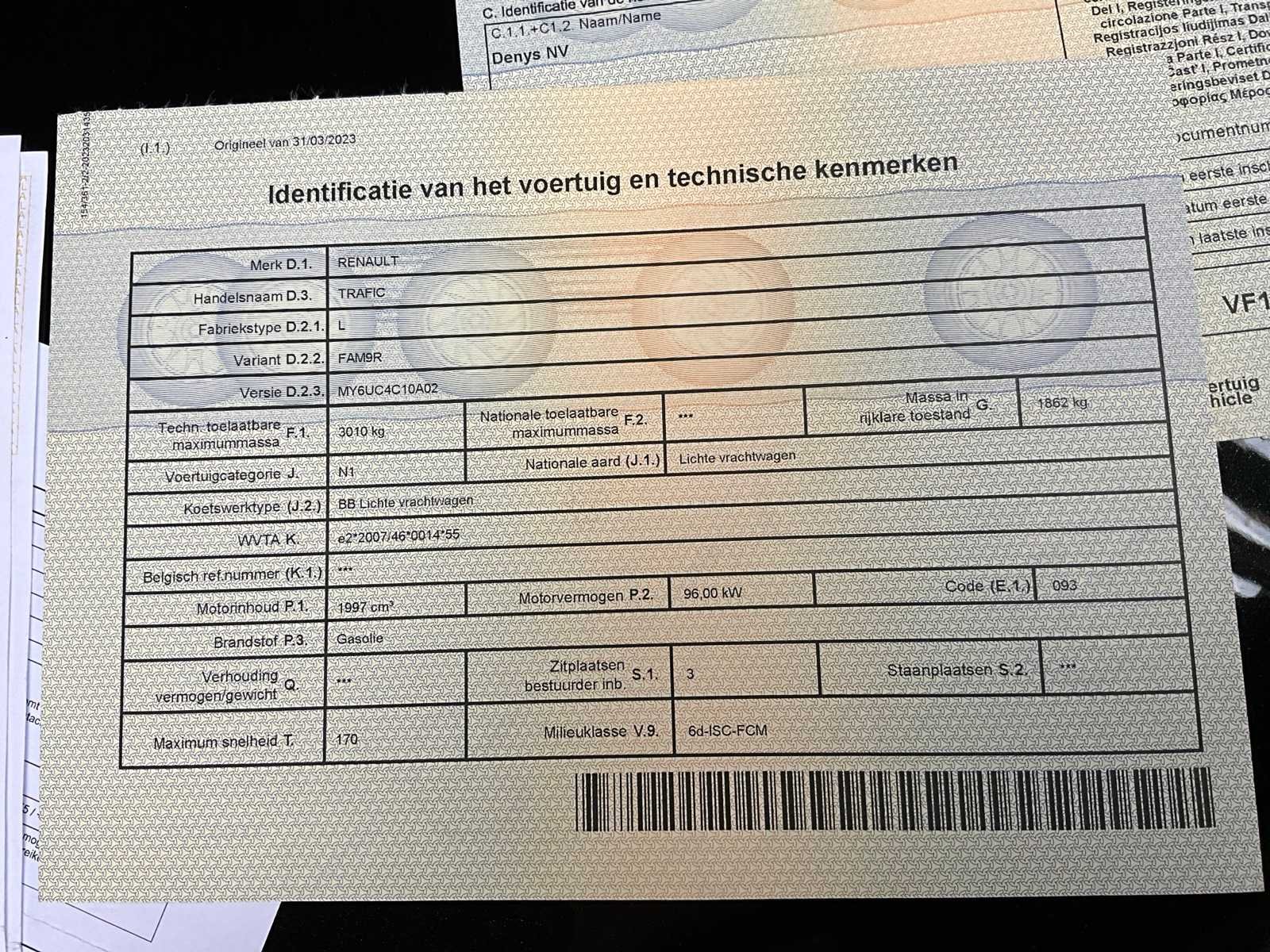 Nee Merk: Renault Model: Trafic Bouwjaar: 2023 Afgelezen kilometerstand: 49951km Cilinderinhoud: 1997cc Vermogen (kW): 96kW Brandstof: diesel Chassisnummer: VF1FL000270597789 Datum eerste toelating: 31/03/2023 Nationaliteit documenten: Belgisch Start en rijdt: Start en rijdt startinformatie : Ja Inschrijvingsbewijs - deel 1 : Aanwezig Inschrijvingsbewijs - deel 2: Aanwezig
