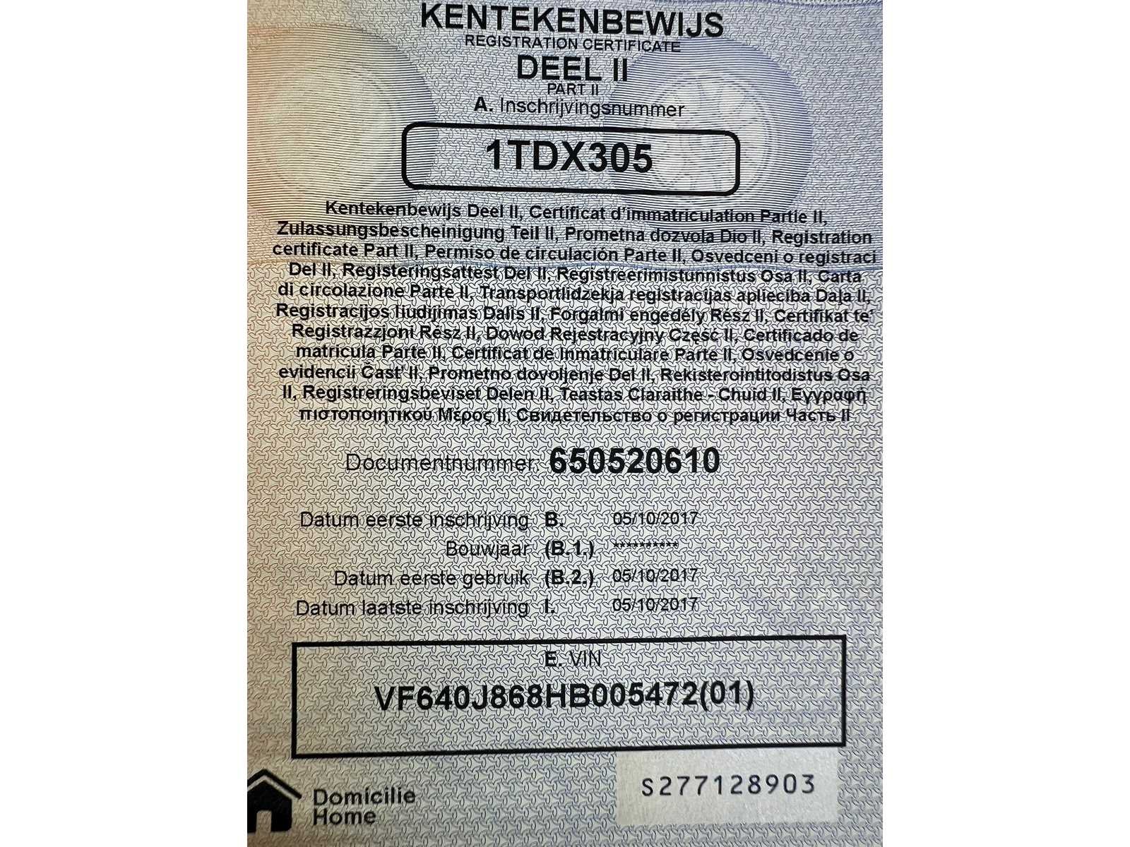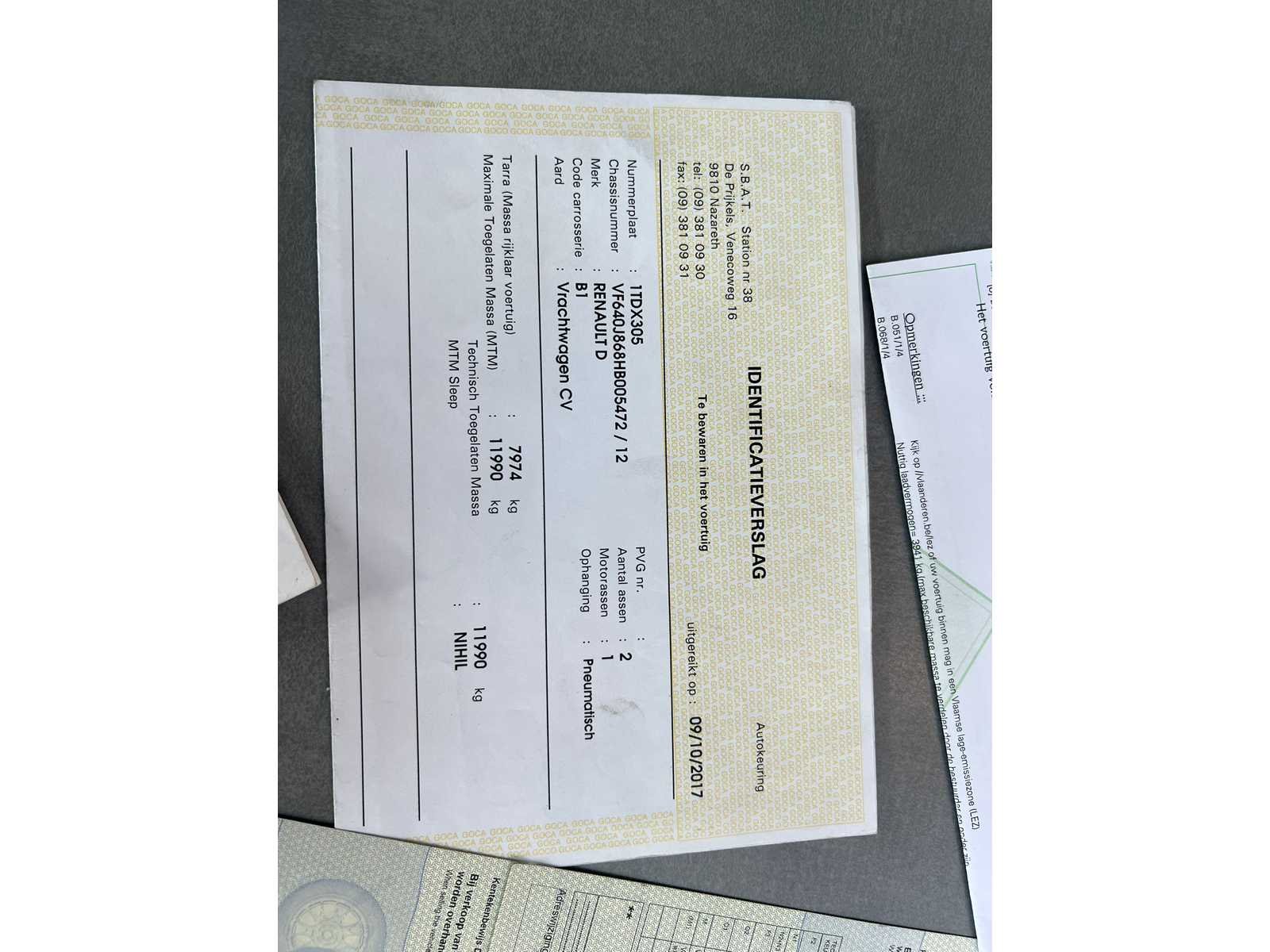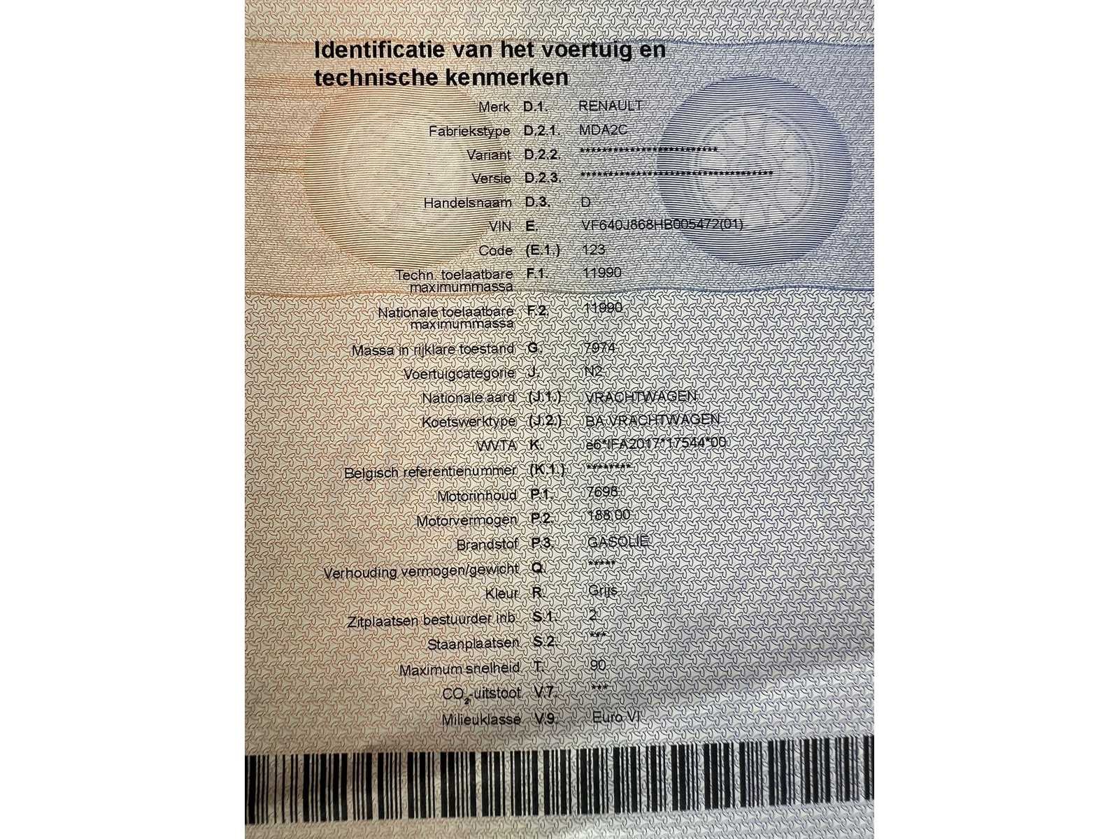 Nee Merk: Renault Type: MDA2C Bouwjaar: 2017 Chassisnummer VIN: VF640J868HB005472 Cilinderinhoud: 7698cc Datum eerste toelating: 05/10/2017 Fuel Type: Diesel Startinformatie: Start en rijdt Afgelezen kilometerstand: 439385km Nationaliteit documenten: Belgisch