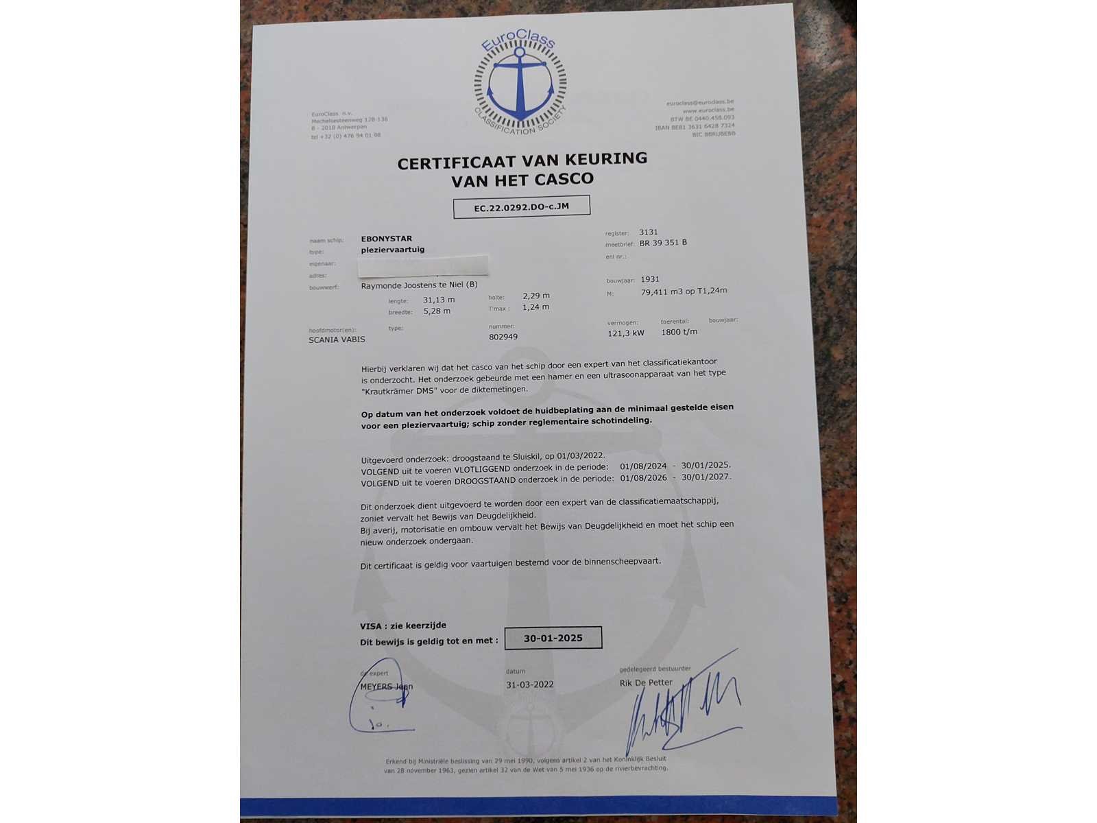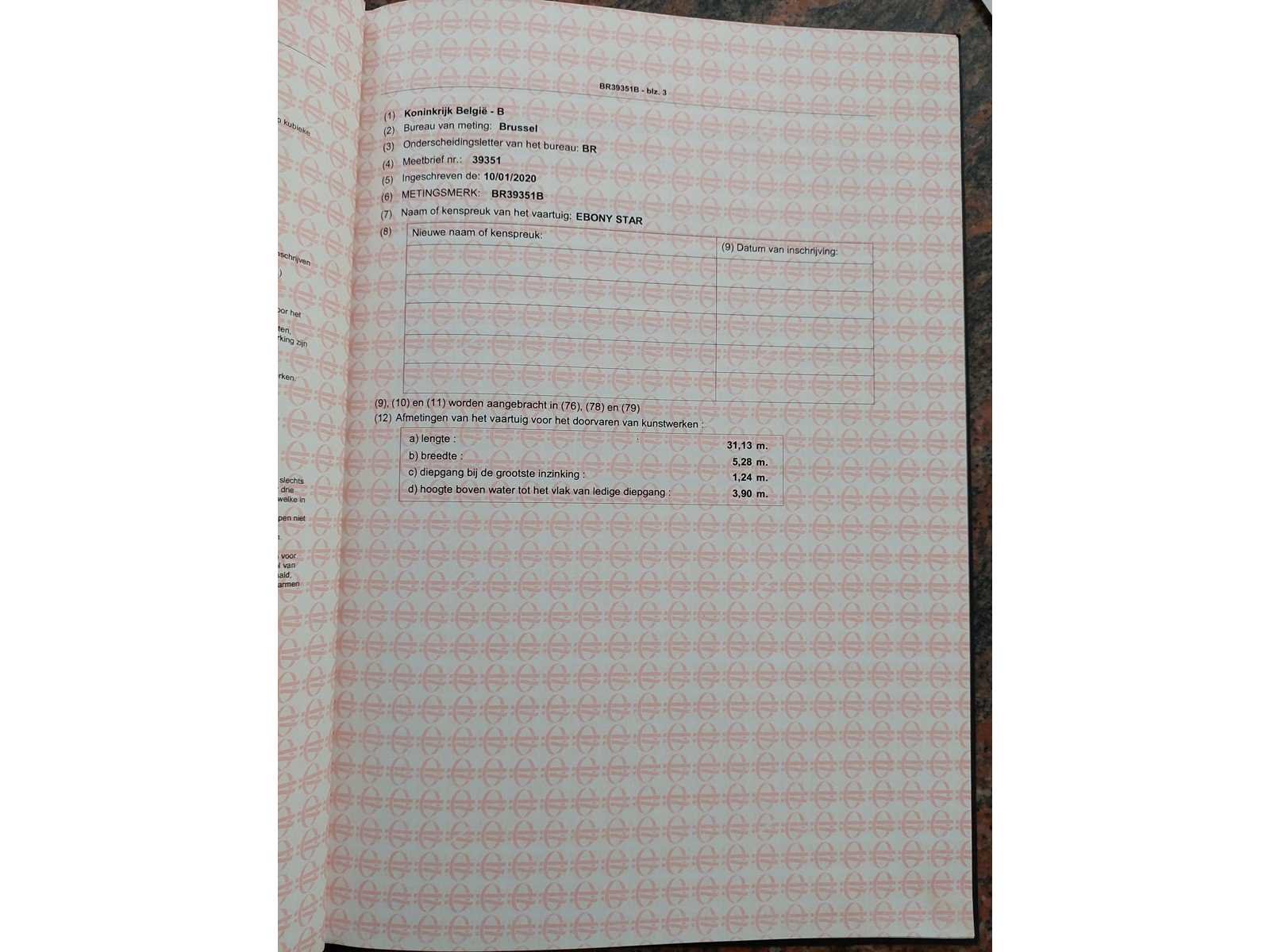 Het schip is zelfvoorzienend van elektriciteit. De motor van het schip draait en het schip kan varen. Vermogen: 121,3 KW Toerental: 1800t/m Voorzien van 2 slaapkamers, een bergruimte vooraan in het schip. Nee Merk: Ebonystar Lengte: 3130cm Breedte: 528cm