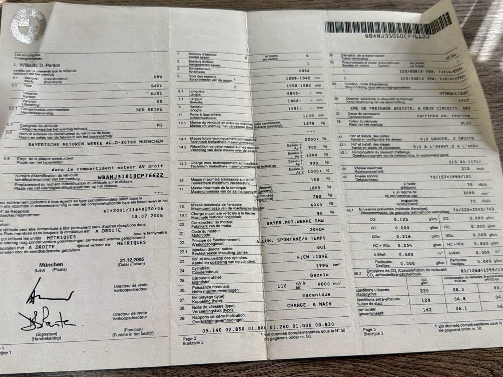 Start en rijdt goed, maar zeker niet in perfecte staat. Airco Koetswerk: diverse krassen, lakschade en deuken rondom (zie foto’s). Beschadiging aan rechterachterzijde (spatbord & bumper). Enkele krassen en lakafbladdering vooraan. Binnenkant: normaal gebruikt, zetels en interieur vertonen slijtage. Bandenspanningswaarschuwing ("lekke band") actief op display. Ramenbediening: knoppen deels versleten, maar functioneel. ABS-lampje brandt op dashboard. M-sport stylingdetails aanwezig (versnellingspook, logo’s). Trekhaak aanwezig. Belgische boorddocumenten aanwezig, inclusief: Gelijkvormigheidsattest (COC) Inschrijvingsbewijs Deel I + bewijs van verlies Keuringsbewijs geldig tot 07/06/2025 Carpass aanwezig Rapport "Staat van het voertuig voor verkoop" (GOCA) No Merk: BMW Model: 520D Touring Bouwjaar: 2006 Afgelezen kilometerstand: 361815km Cilinderinhoud: 1995cc Vermogen (kW): 110kW Brandstof: diesel Chassisnummer: WBANJ31010CP76622 Datum eerste toelating: 20/1/2006 Aantal zitplaatsen: 5 Kleur: blauw Transmissie: handgeschakeld Emissieklasse: Euro 4 Ledig gewicht: 1675kg Nationaliteit documenten: B Start en rijdt: ja Keuringsrapport geldig tot: 7/6/2025 Zichtbare schade: ja Vavato voert geen technische keuring uit.: true Airconditioning: true