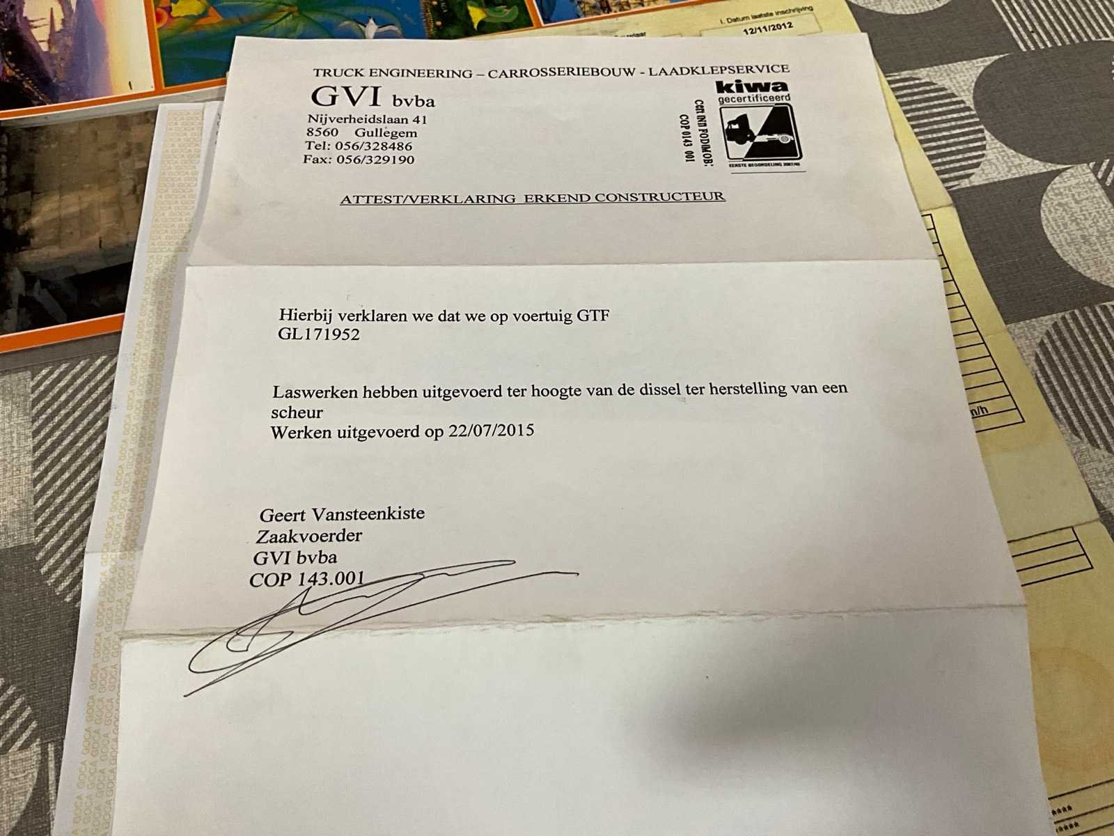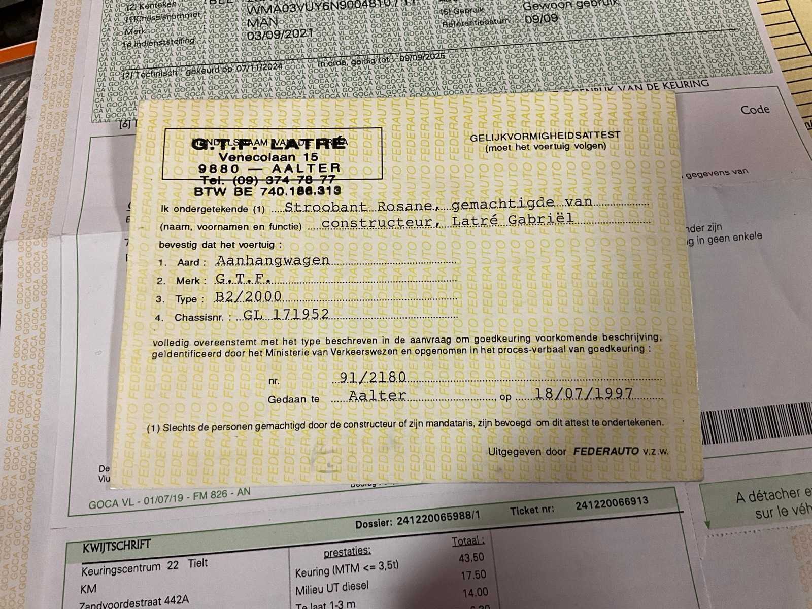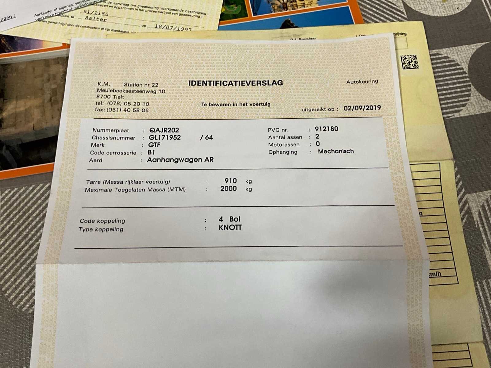 Basisgegevens • Merk: GTF (soms vermeld als G.T.F.) • Type: B2/2000 • Model: AR (Aanhangwagen) • Chassisnummer: GL171952 / 64 • Datum eerste toelating: 18/07/1997 • Bouwjaar: 1997 • Kentekenpapieren compleet: Ja • Nationaliteit documenten: België ⸻ Technische gegevens • Aantal assen: 2 • Ledig gewicht (Tarra): 910 kg • Laadvermogen: 2000 kg MTM – 910 kg tarra = ca. 1090 kg nuttig laadvermogen • Maximaal toegelaten massa (MTM): 2000 kg • Ophanging: Mechanisch • Type koppeling: Knott – 4 bol Nee Merk: GTF Type: B2/2000 Model: AR Bouwjaar: 1997 Chassisnummer: GL171952 / 64 Aantal assen: 2 Ledig gewicht: 910kg Laadvermogen: 2000kg Datum eerste toelating: 18071997 Hoogte: 192cm Lengte: 340cm Breedte: 157cm Nationaliteit documenten: Belg