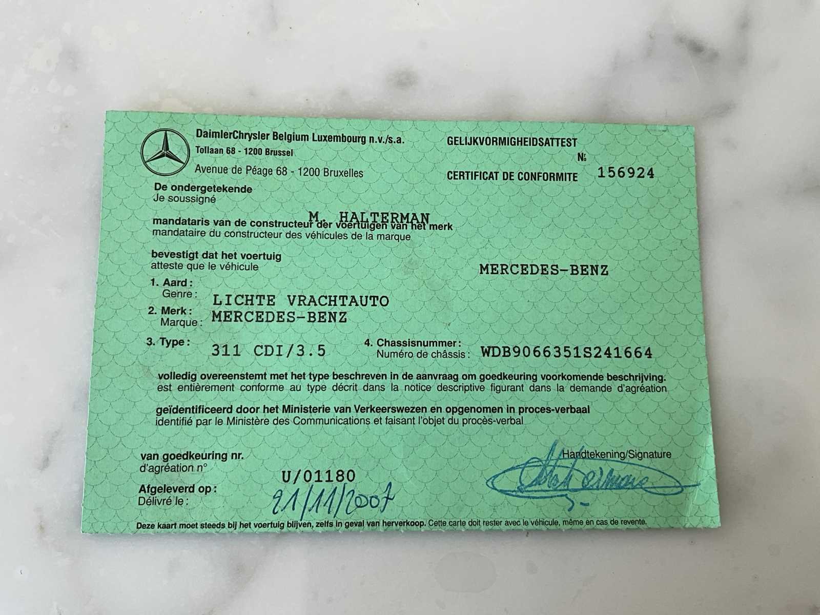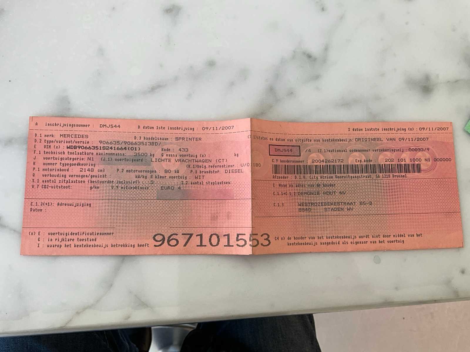 Nee Merk: Mercedes-Benz Model: Sprinter Bouwjaar: 2007 Afgelezen kilometerstand: 166968km Cilinderinhoud: 2148cc Brandstof: diesel Chassisnummer: WDB9066351S241664 Datum eerste toelating: 09/11/2007 Vermogen (pk): 80hp Aantal zitplaatsen: 3 Transmissie: Handgeschakeld Emissieklasse: Euro 4 Aantal deuren: 4 Aantal sleutels: 1 Gelijkvormigheidsattest aanwezig: true Start en rijdt: Ja