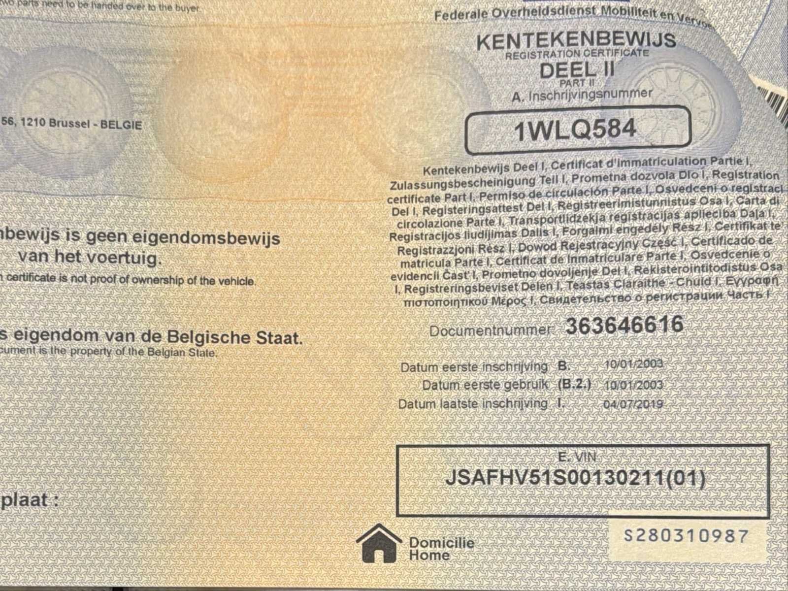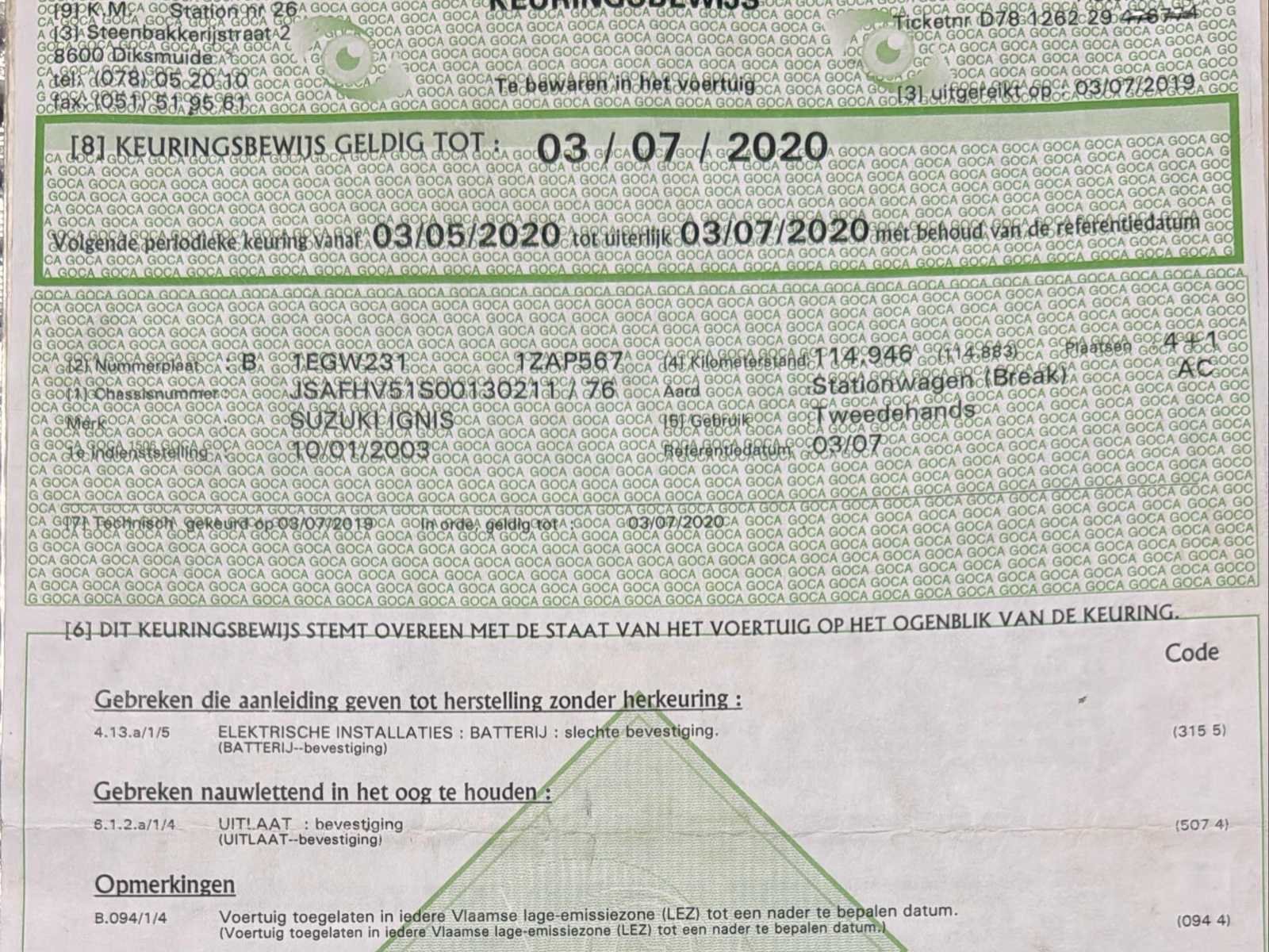 Nee Merk: Suzuki Model: Ignis Type: WTAK Bouwjaar: 2003 Afgelezen kilometerstand: 118800km Cilinderinhoud: 1328cc Vermogen (kW): 61kW Brandstof: Benzine Chassisnummer: JSAFHV51S00130211 Laadvermogen: 710kg Datum eerste toelating: 10/01/2003 Vermogen (pk): 83hp Aantal zitplaatsen: 5 Transmissie: Handgeschakeld Emissieklasse: Euro 4 Ledig gewicht: 945kg Aantal cilinders: 4 Nationaliteit documenten: BE CO2-uitstoot NEDC: 162 Gelijkvormigheidsattest aanwezig: true Start en rijdt: Ja Keuringsrapport geldig tot: 03/07/2020 Inschrijvingsbewijs - deel 1 : Ok Inschrijvingsbewijs - deel 2: ok