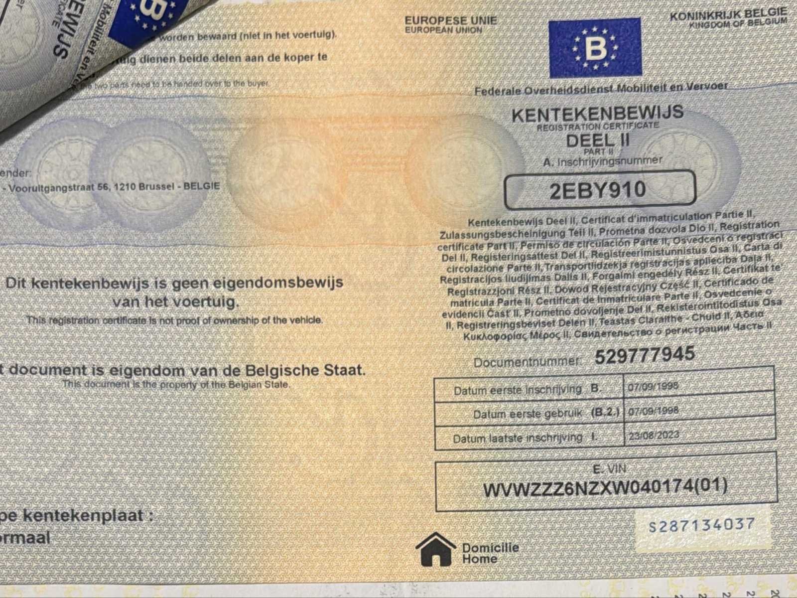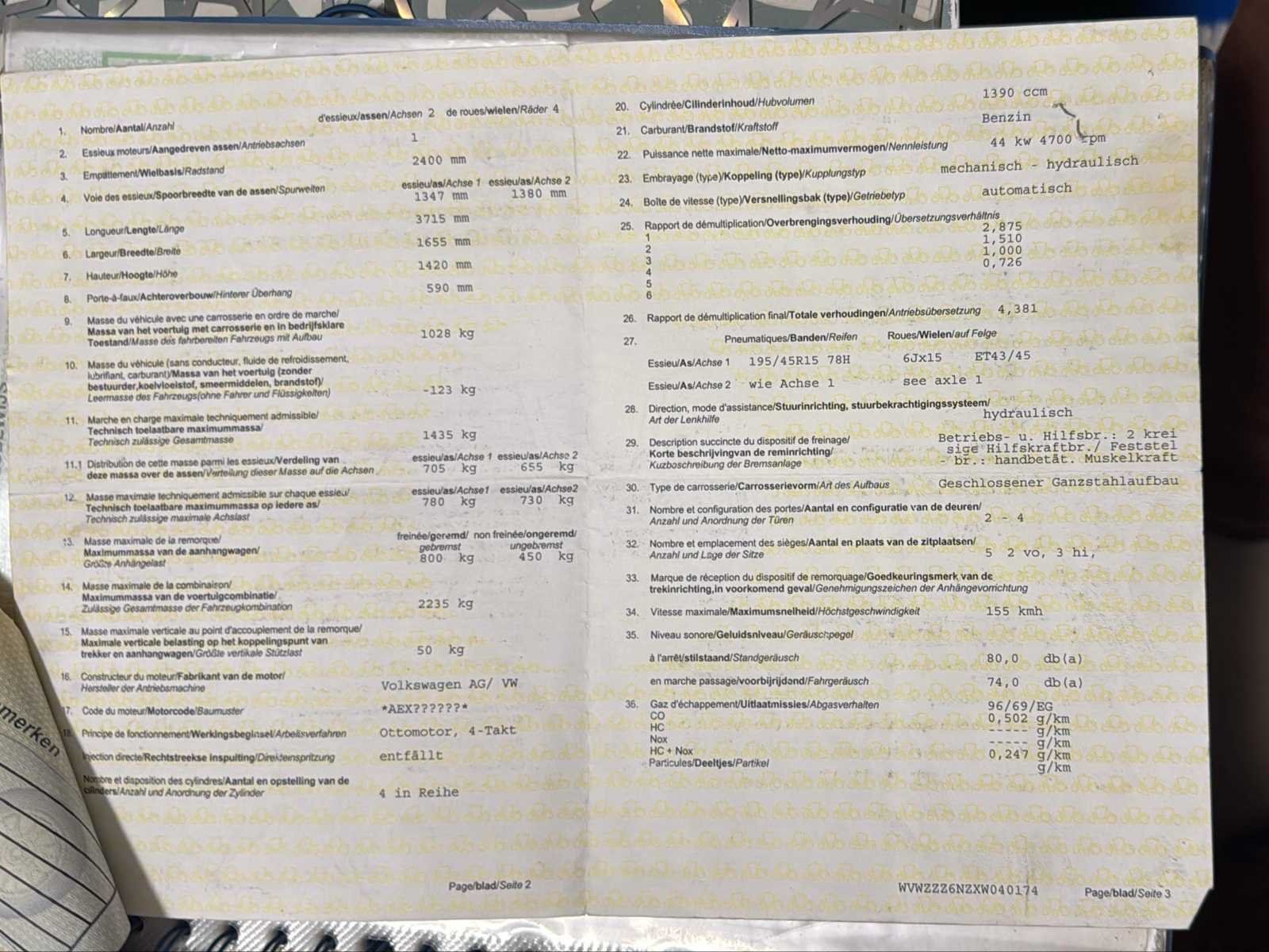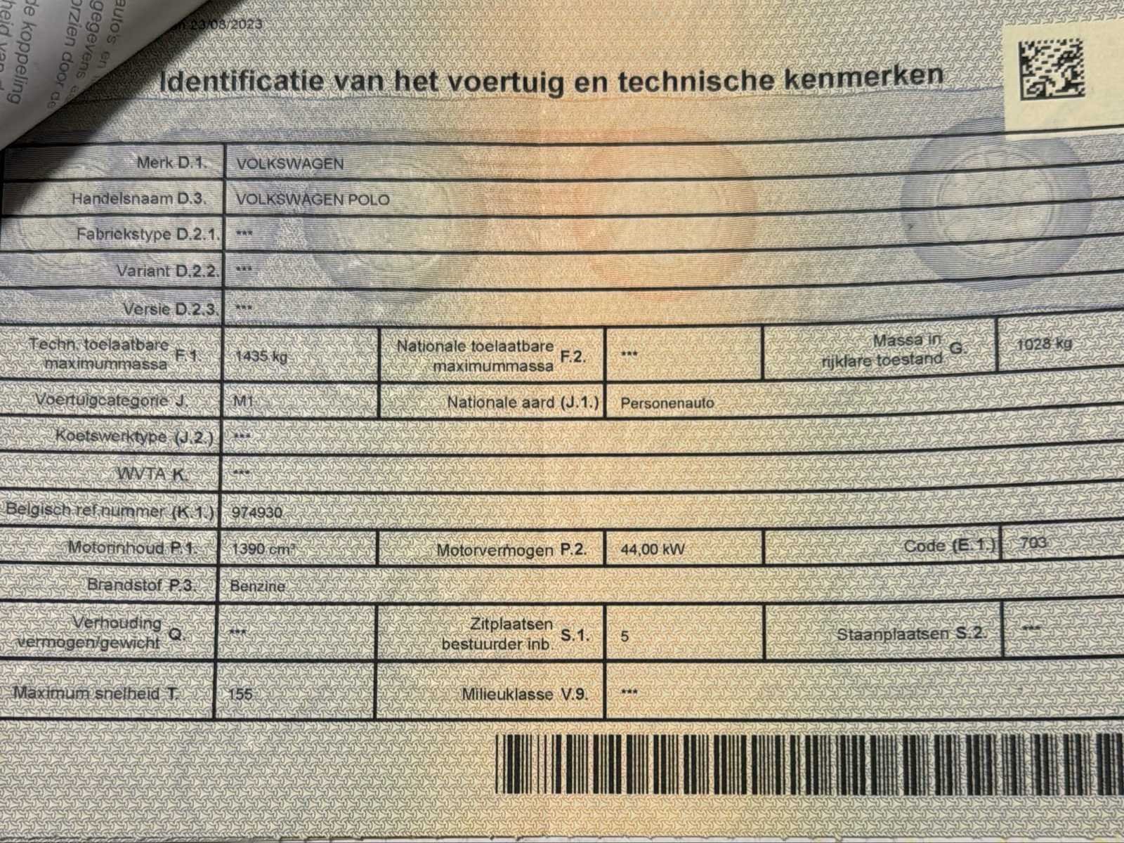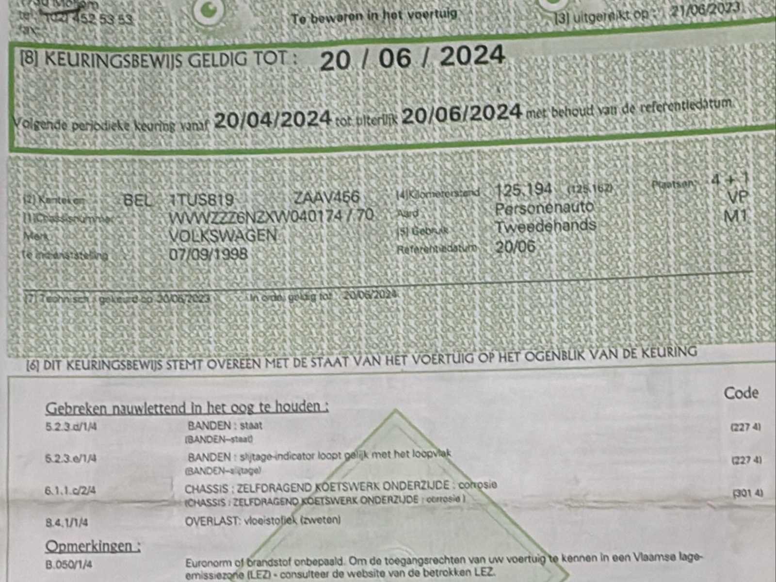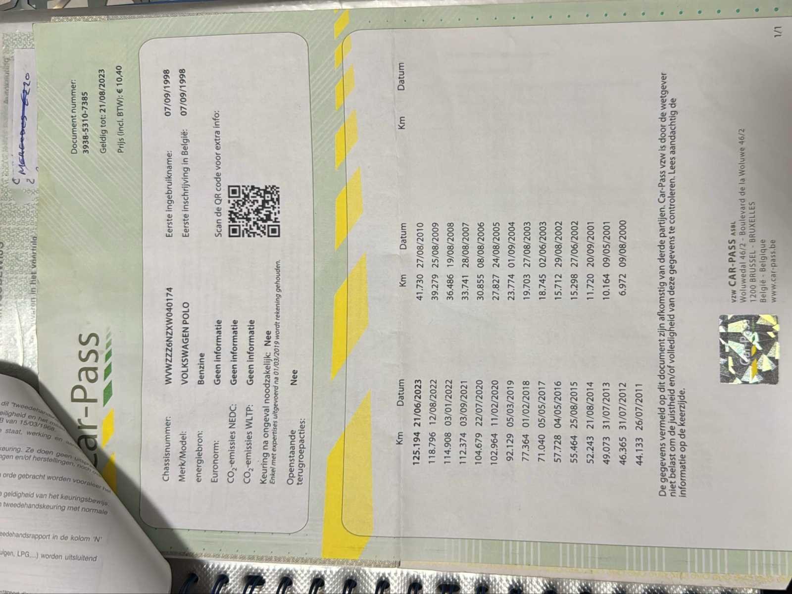 Nee Merk: Volkswagen Model: Polo Type: 6N Bouwjaar: 1998 Afgelezen kilometerstand: 126636km Cilinderinhoud: 1390cc Vermogen (kW): 44kW Brandstof: Benzine Chassisnummer: WVWZZZ6NZXW040174 Laadvermogen: 407kg Datum eerste toelating: 07/09/1998 Vermogen (pk): 60hp Aantal zitplaatsen: 5 Transmissie: Automatisch Emissieklasse: Euro 2 Ledig gewicht: 1028kg Nationaliteit documenten: BE Gelijkvormigheidsattest aanwezig: true Carpass: true Start en rijdt: Ja Keuringsrapport geldig tot: 20/06/2024 Inschrijvingsbewijs - deel 1 : Ok Inschrijvingsbewijs - deel 2: Ok