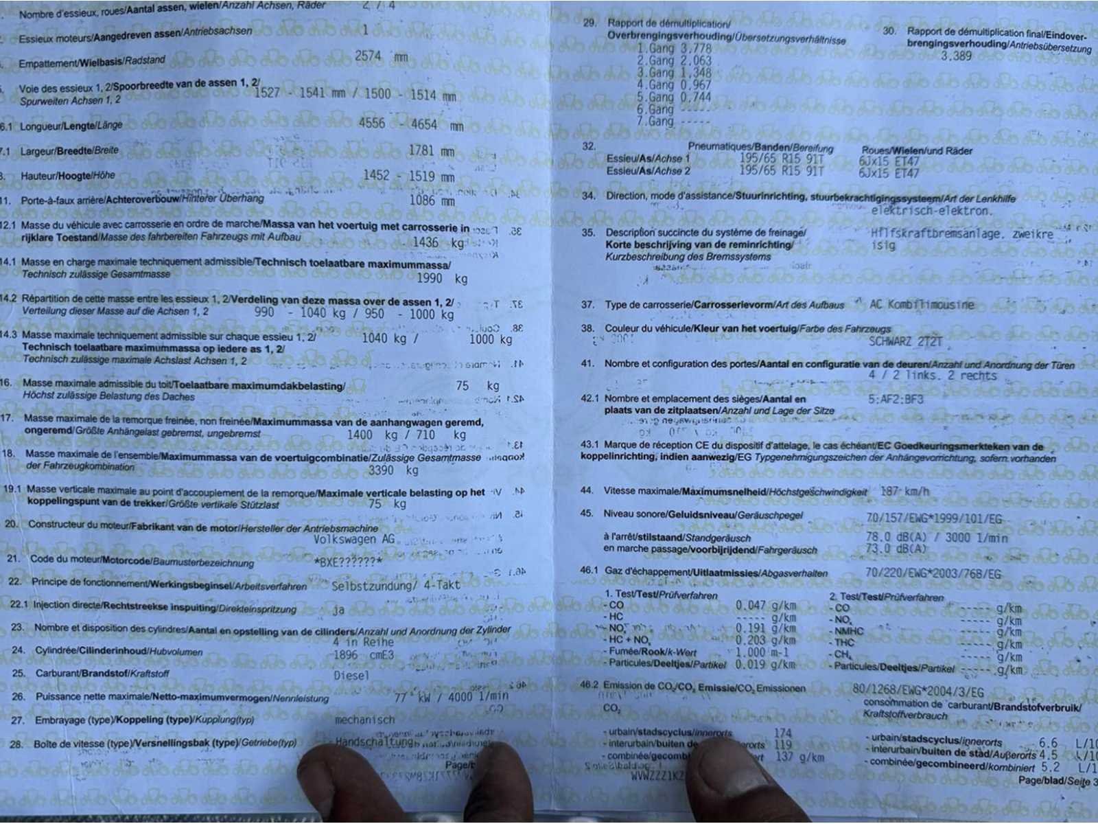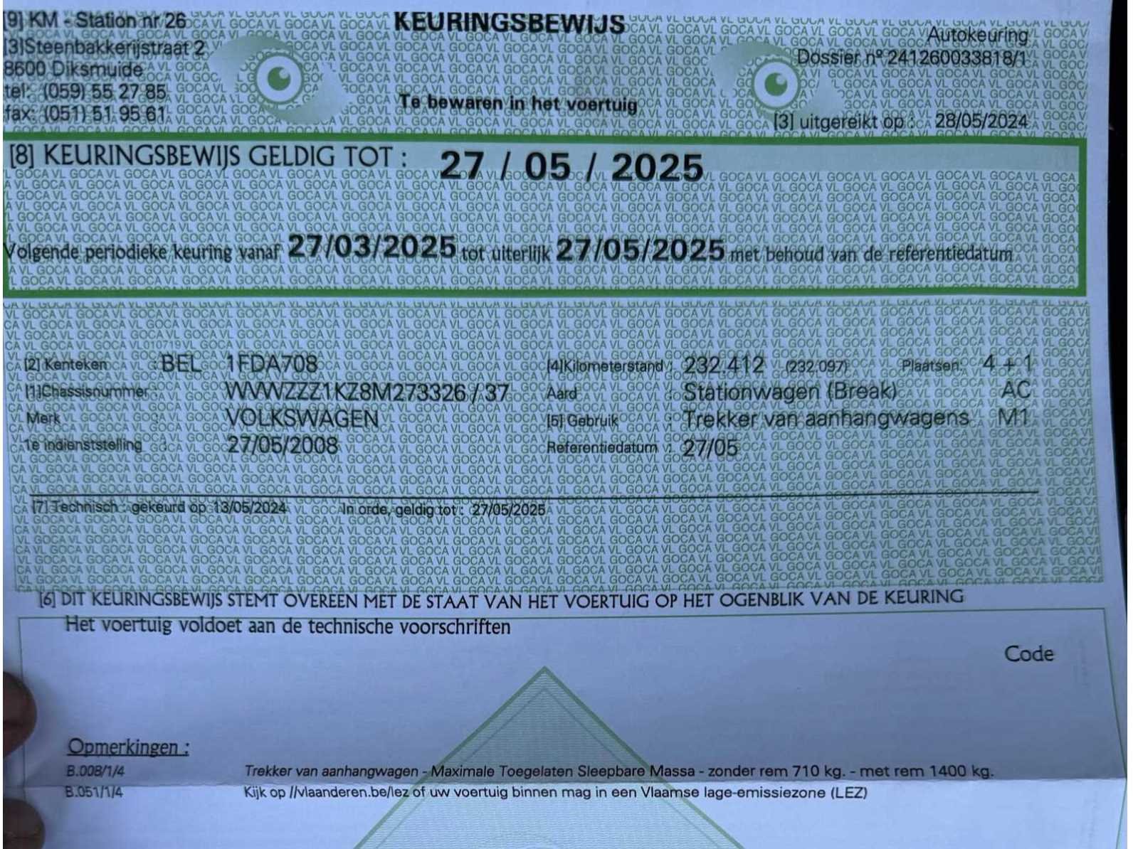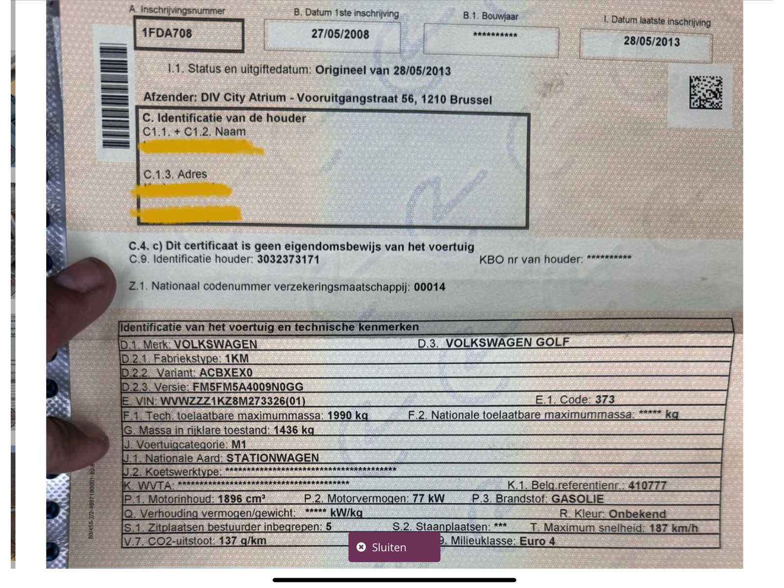 Nee Merk: Volkswagen Model: Golf 5 Break Bouwjaar: 2008 Afgelezen kilometerstand: 239974km Cilinderinhoud: 1896cc Vermogen (kW): 77kW Brandstof: Diesel Chassisnummer: 273326 Laadvermogen: 555kg Datum eerste toelating: 27/05/2008 Aantal zitplaatsen: 5 Emissieklasse: Euro 4 Ledig gewicht: 1436kg Carrosserie: Stationwagen Nationaliteit documenten: BE CO2-uitstoot NEDC: 137 Start en rijdt: Ja Keuringsrapport geldig tot: 27/05/2025 startinformatie : Start, rijdt, remt Vavato voert geen technische keuring uit.: true Inschrijvingsbewijs - deel 1 : Ok Inschrijvingsbewijs - deel 2: ok