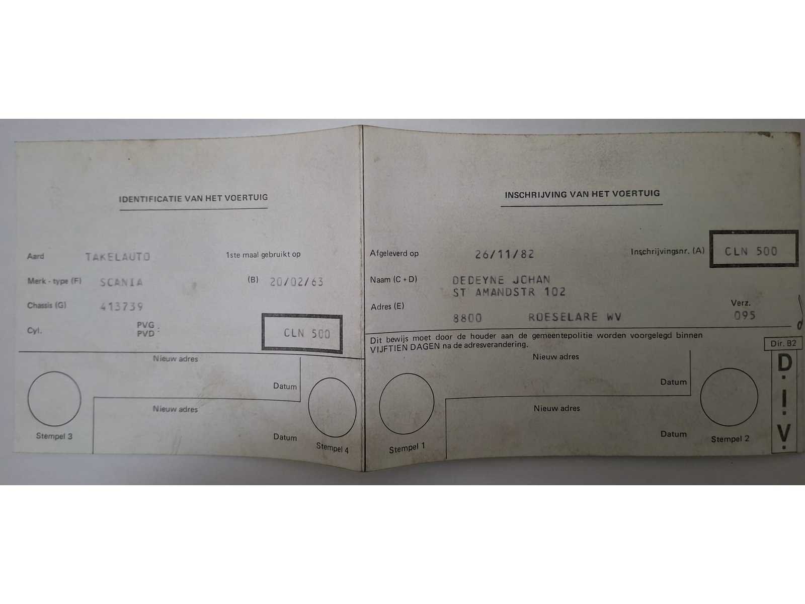 Te restaureren. Nee Merk: Scania Type: L.75.34BDRT Bouwjaar: 1963 Chassisnummer VIN: 413739 Cilinderinhoud: 10038cc Kilometerstand bij opname: 86532km Datum eerste toelating: 20/02/1963 Fuel Type: Diesel Afgelezen kilometerstand: 86532km Handgeschakelde versnellingsbak: true Diesel: true