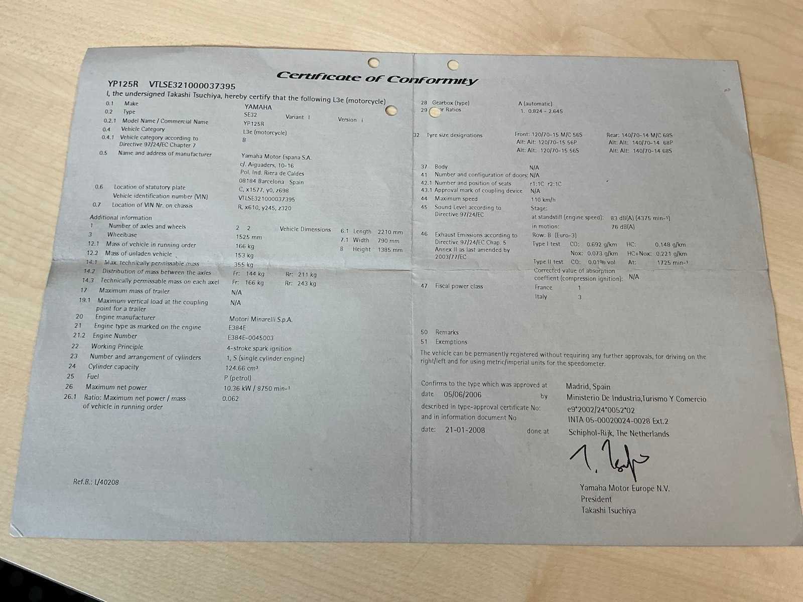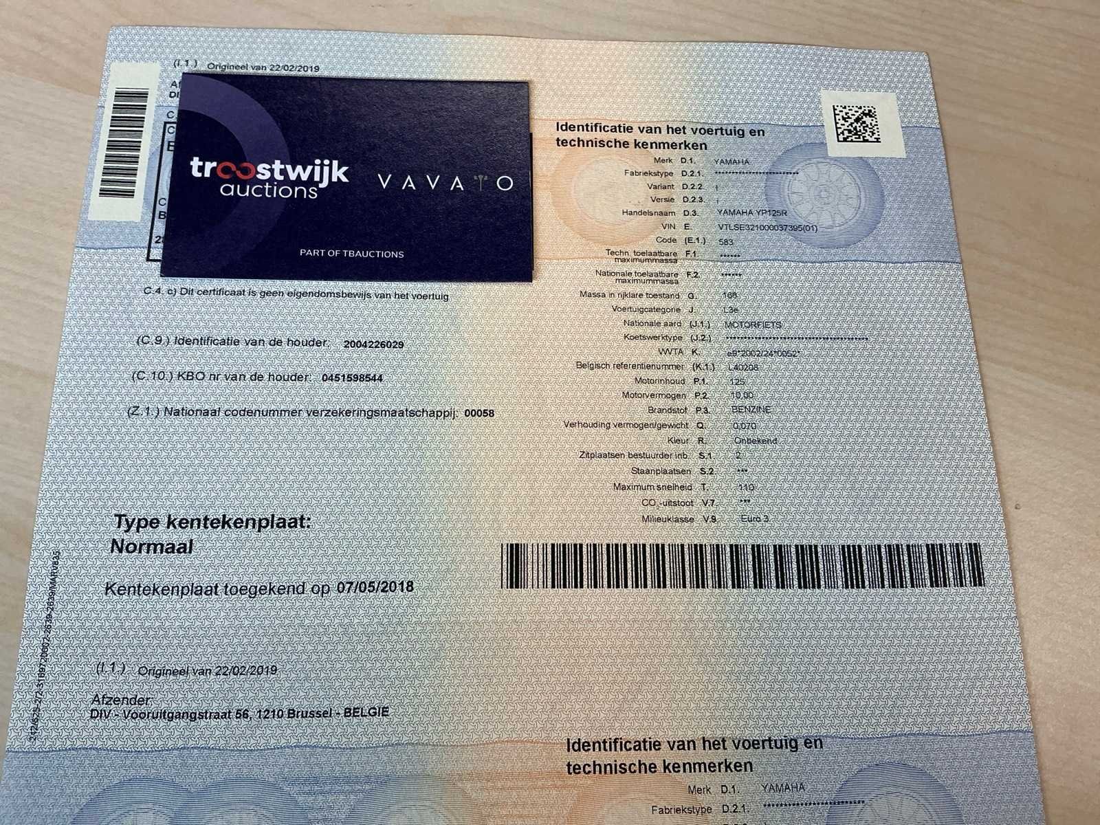 Blikschade. Batterij op te laden. Motorisch oké. No Merk: Yamaha Model: Xmax Chassisnummer: VTLSE321000038395 Cilinderinhoud: 125cc Datum eerste toelating: 22/01/2008 Vermogen (kW): 10kW Nationaliteit documenten: België Aantal sleutels: 4 Bouwjaar: 2008