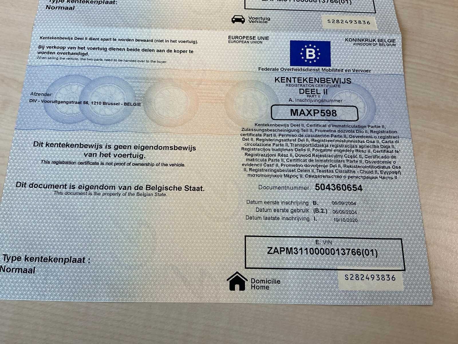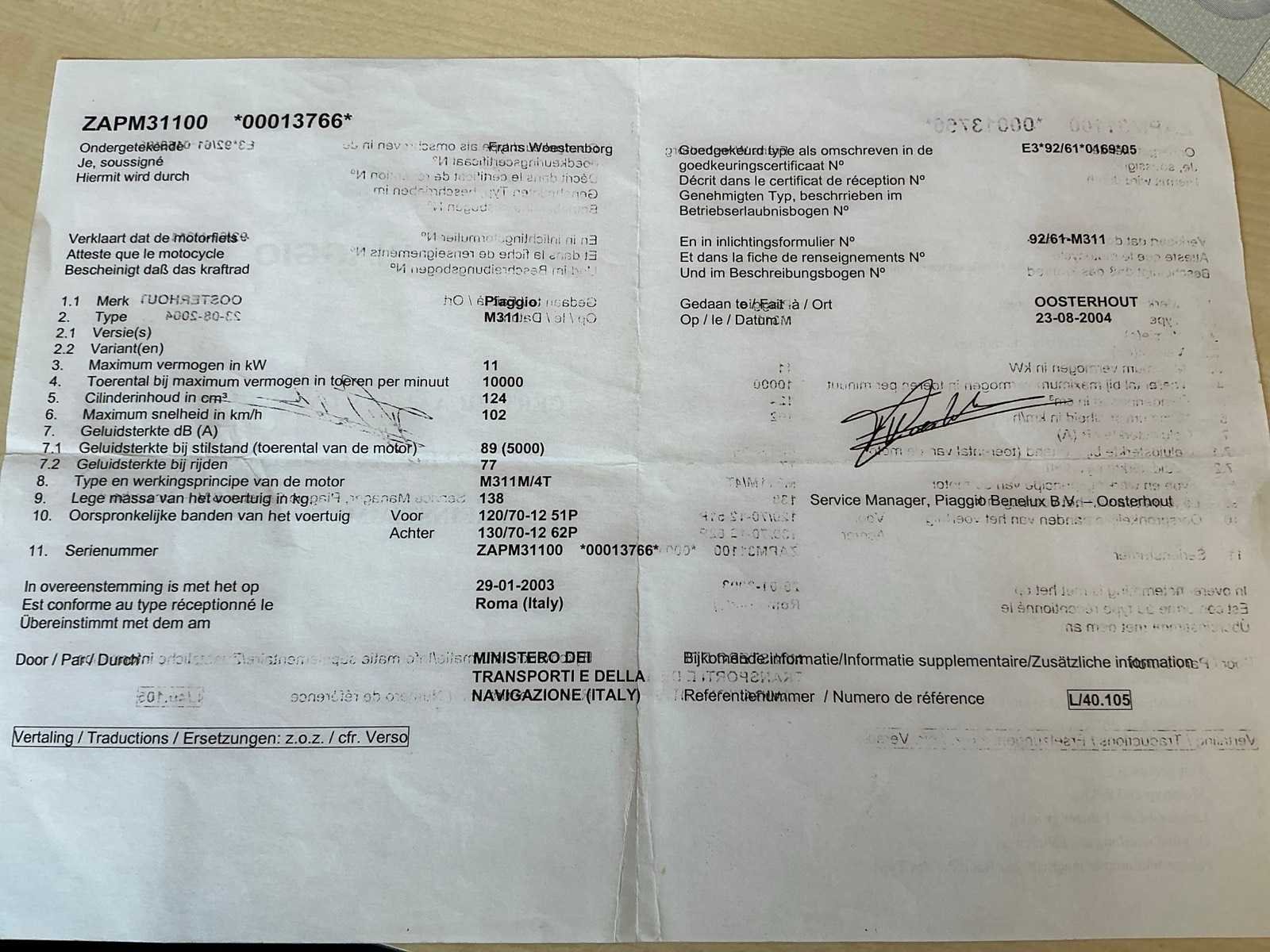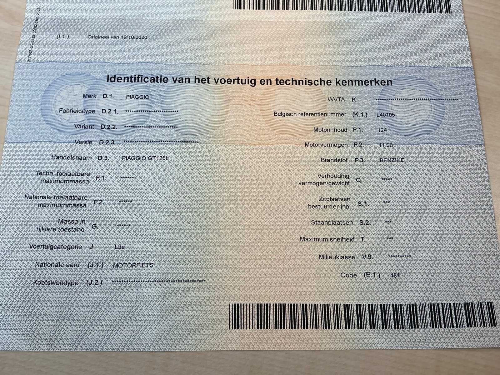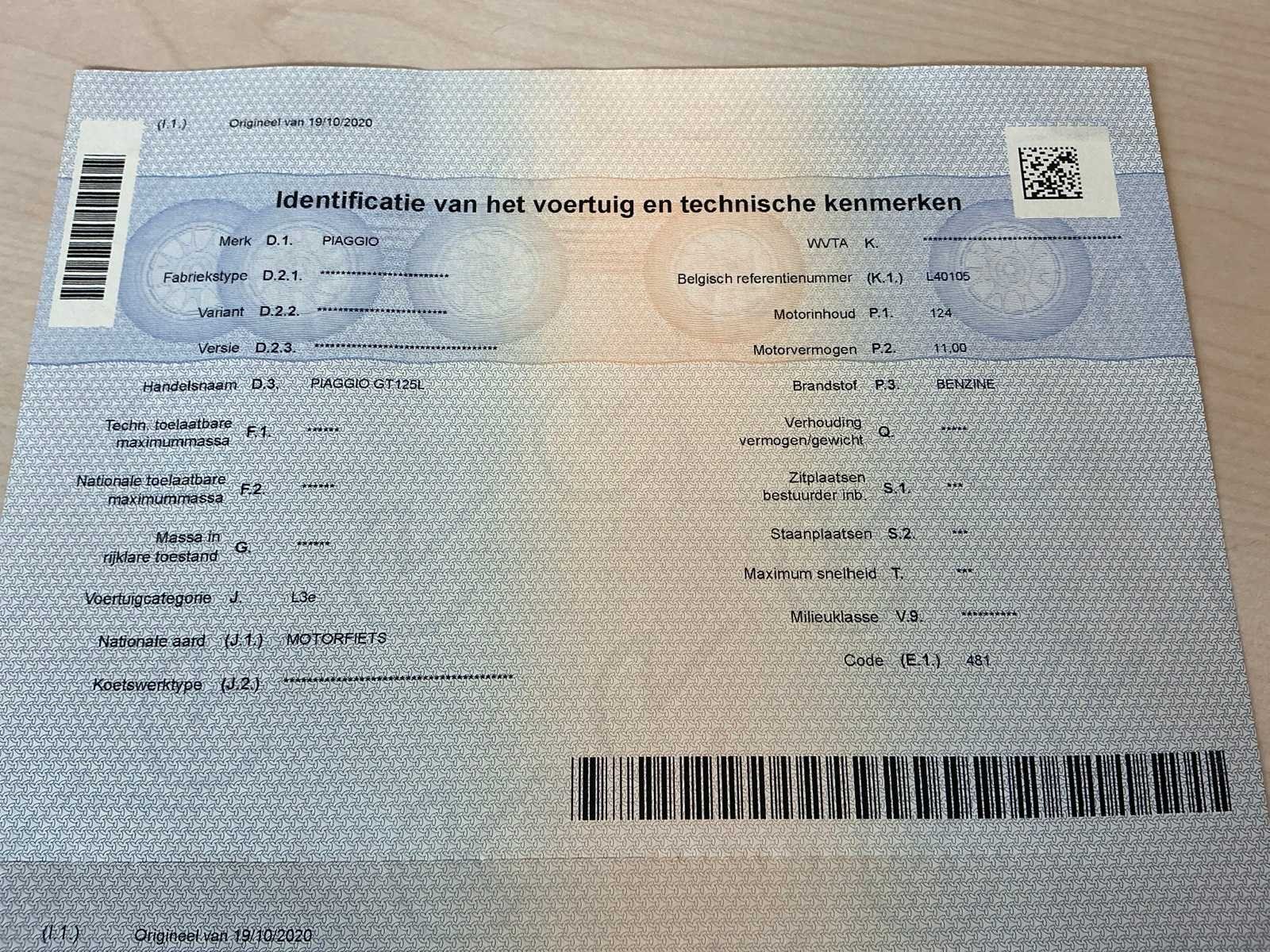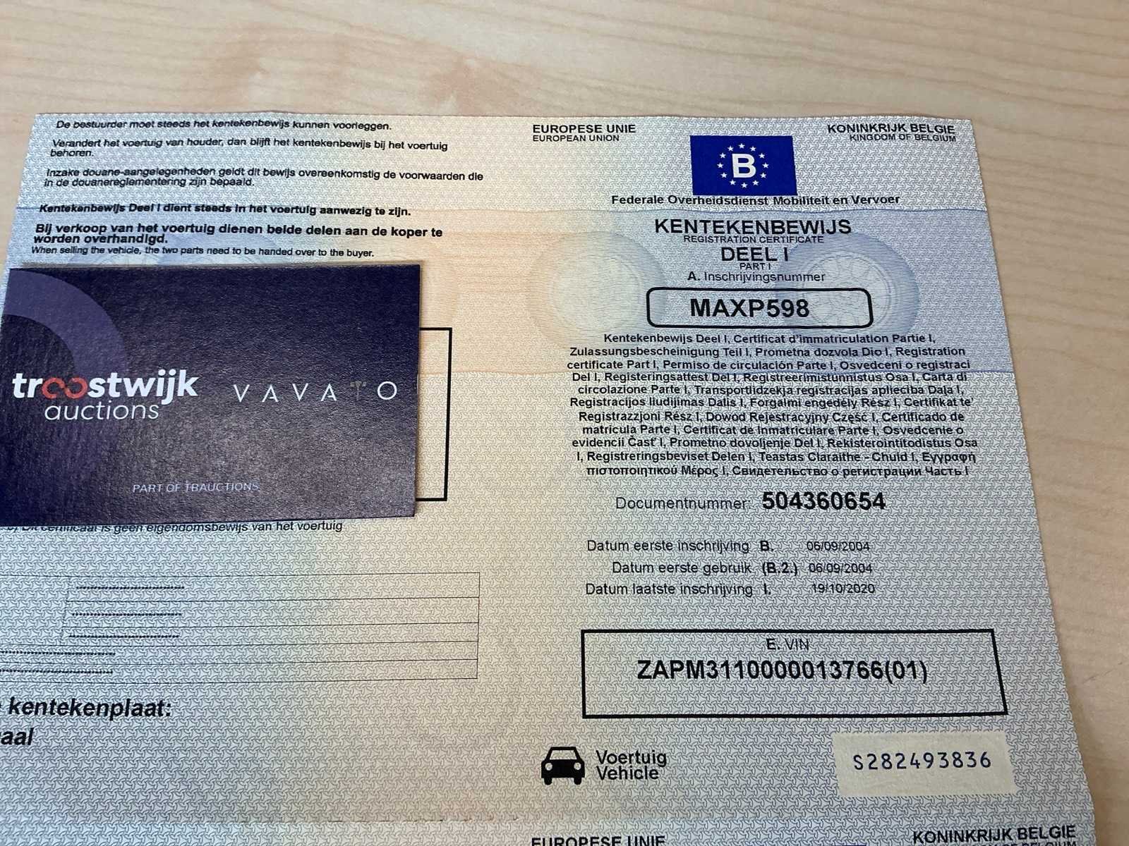 Start en rijdt. Batterij op te laden. No Merk: Piaggio Model: Vespa 125 Chassisnummer: ZAPM3110000013766 Cilinderinhoud: 124cc Datum eerste toelating: 06/09/2004 Vermogen (kW): 11kW Afgelezen kilometerstand: 55421km Nationaliteit documenten: België Aantal sleutels: 2