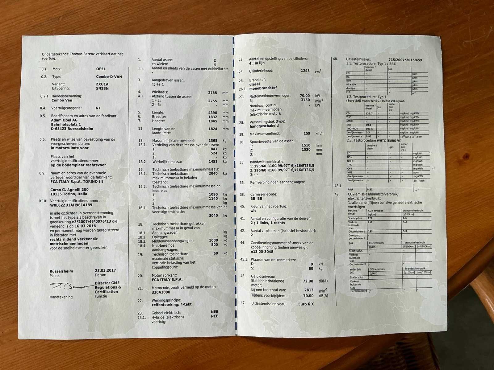 Trekhaak aanwezig Nee Merk: Opel Model: Combo Bouwjaar: 2017 Afgelezen kilometerstand: 103328km Cilinderinhoud: 1248cc Vermogen (kW): 70kW Brandstof: diesel Chassisnummer: W0L6ZZU1AH9614189 Datum eerste toelating: 30/03/2017 Aantal zitplaatsen: 2 Kleur: Wit Transmissie: Handgeschakeld Aantal deuren: 4 Aantal sleutels: 2 Nationaliteit documenten: Belgisch Carpass: true Start en rijdt: Ja Keuringsrapport geldig tot: 04/08/2026 Vavato voert geen technische keuring uit.: true Airconditioning: true Inschrijvingsbewijs - deel 1 : Aanwezig Inschrijvingsbewijs - deel 2: Aanwezig