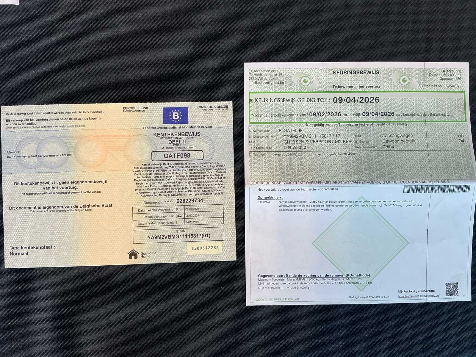 Containerslede aanwezig ( afneembaar) No Merk: Gheysen&verpoort Type: M2VB Bouwjaar: 2020 Chassisnummer: YA9M2VBMG11115817 Chassisnummer VIN: YA9M2VBMG11115817 Laadvermogen: 13850kg Eigen gewicht: 4150kg Aantal assen: 2 Kleur: Zwart Datum eerste toelating: 2020 Lengte: 8600 Breedte: 2550 Hoogte: 1400