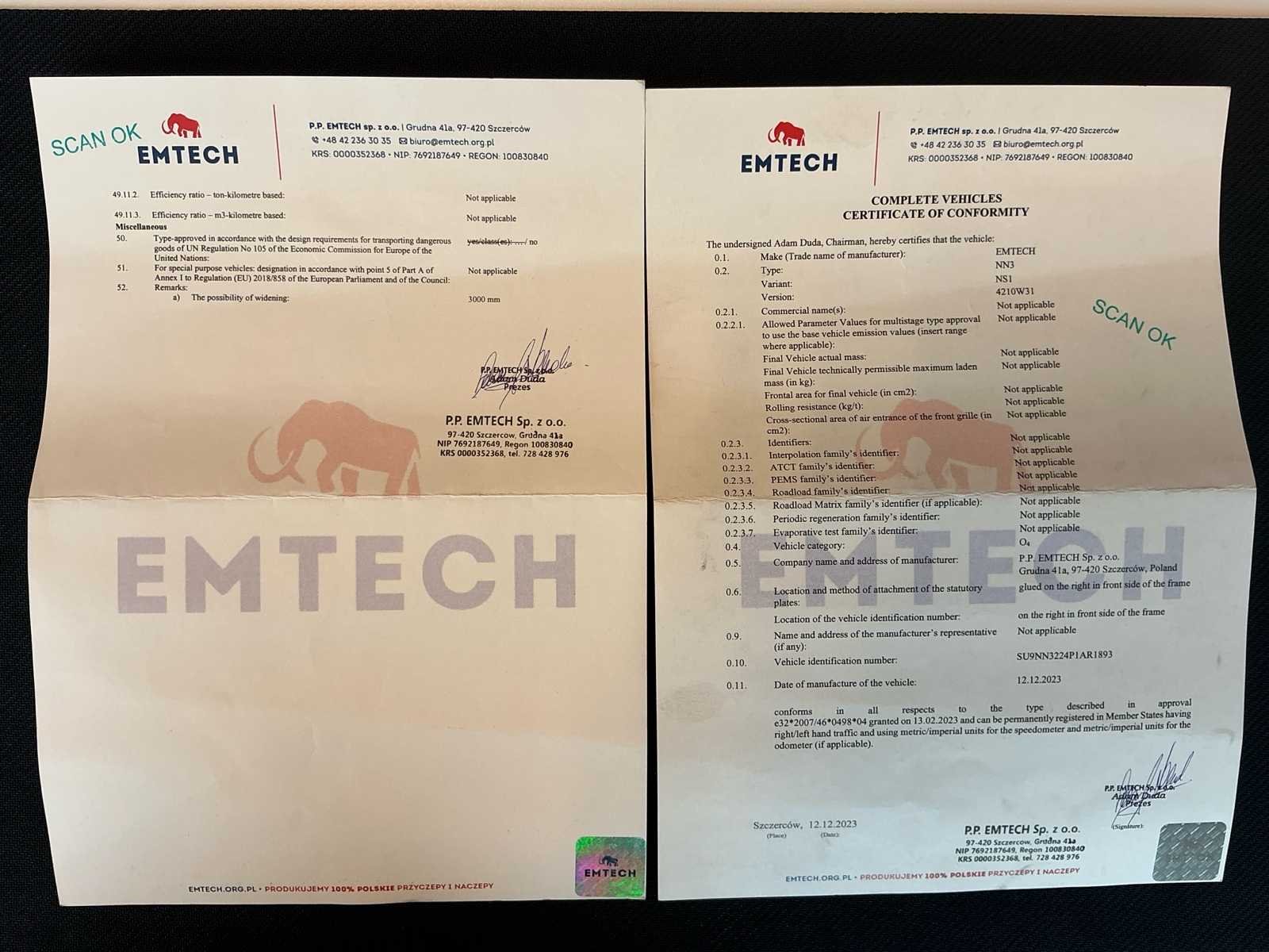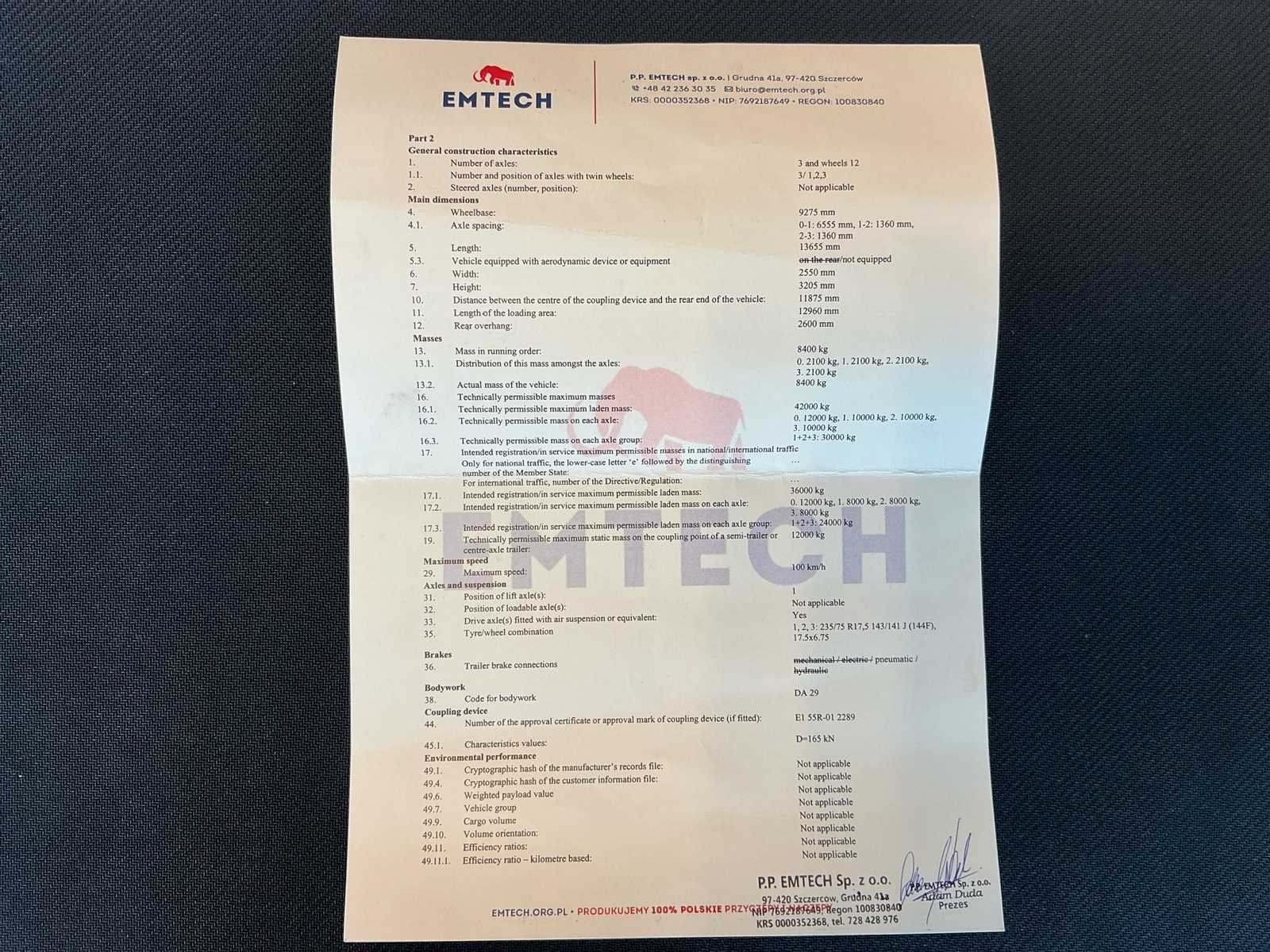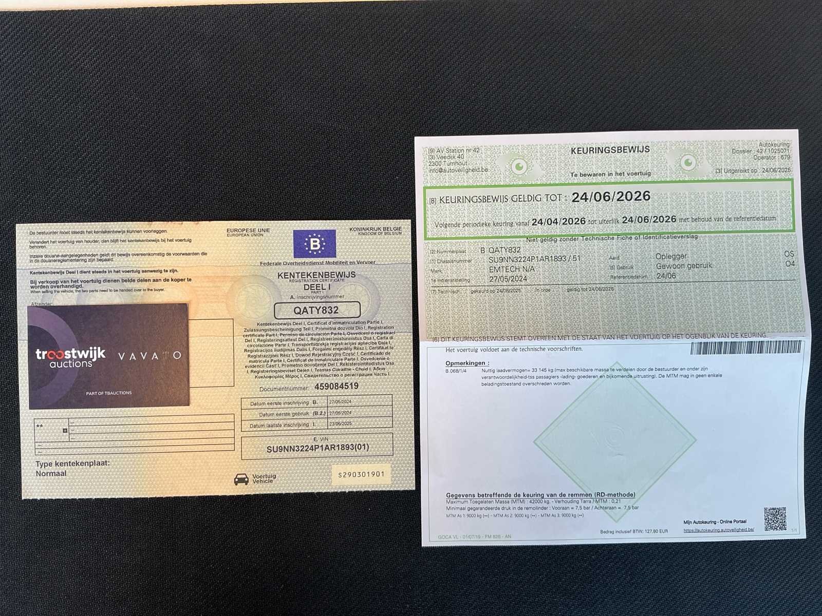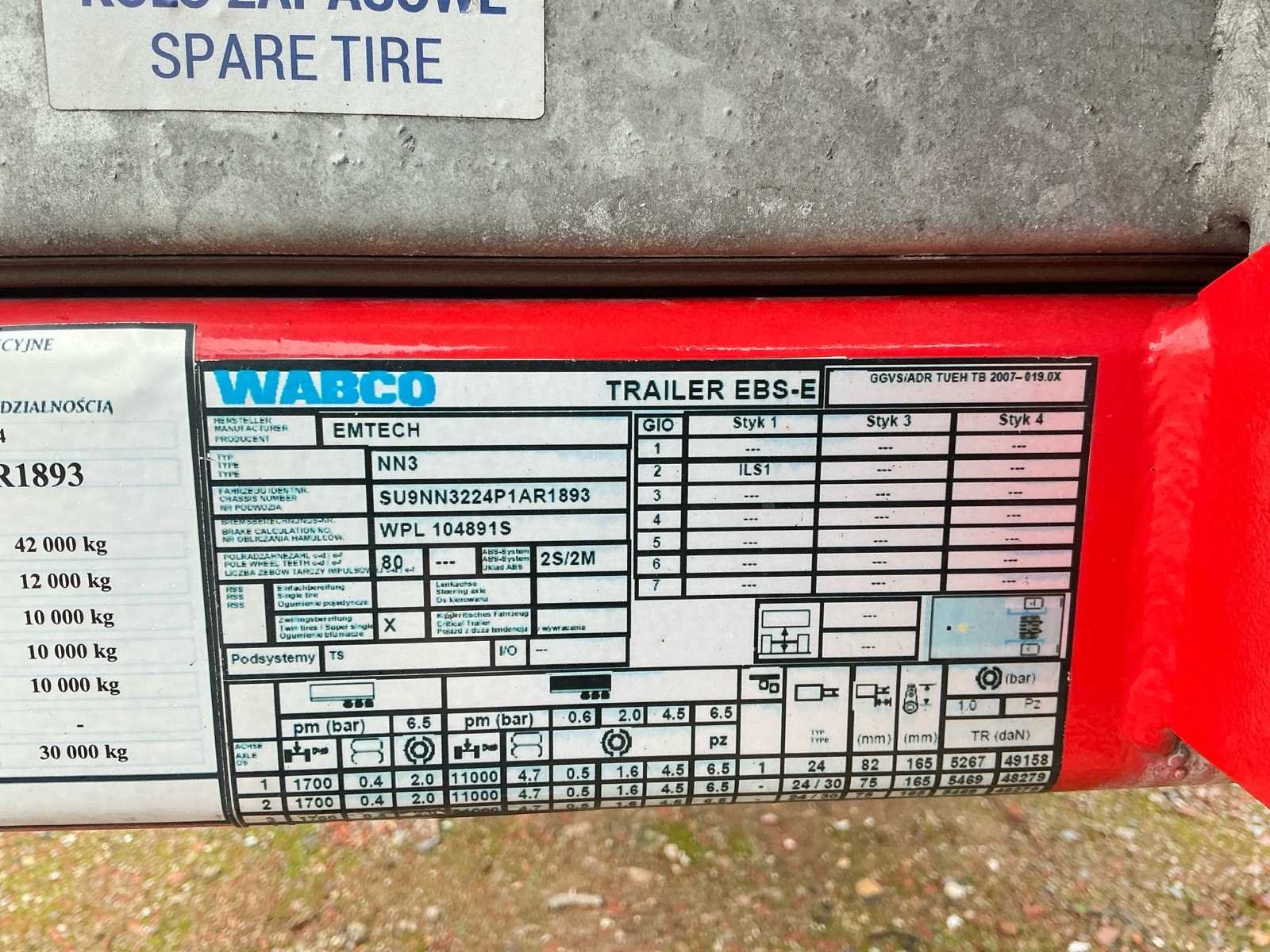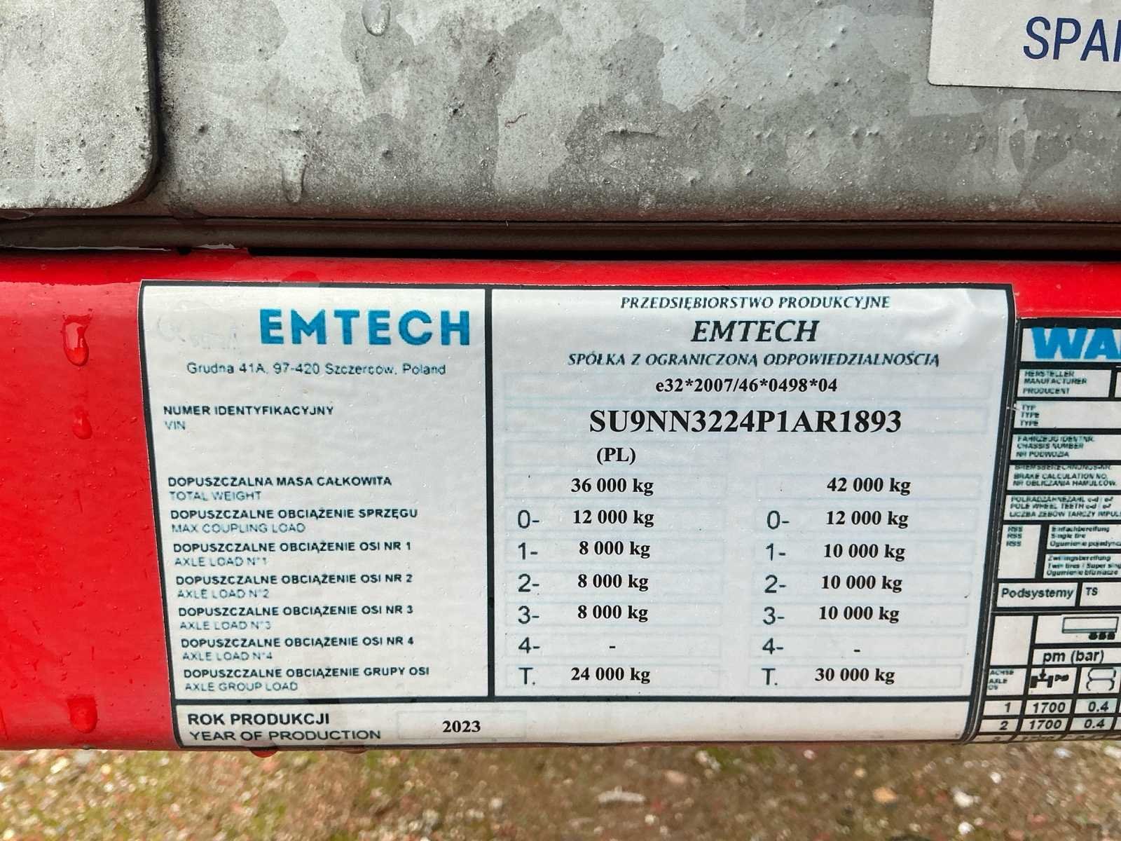 No Merk: Emtech Type: 3NNPS Bouwjaar: 2023 Chassisnummer: SU9NN3224P1AR1893 Chassisnummer VIN: SU9NN3224P1AR1893 Laadvermogen: 33000kg Eigen gewicht: 8500kg Aantal assen: 3 Kleur: Rood Datum eerste toelating: 12/2023 Lengte: 13600 Breedte: 2550 Hoogte: 3200