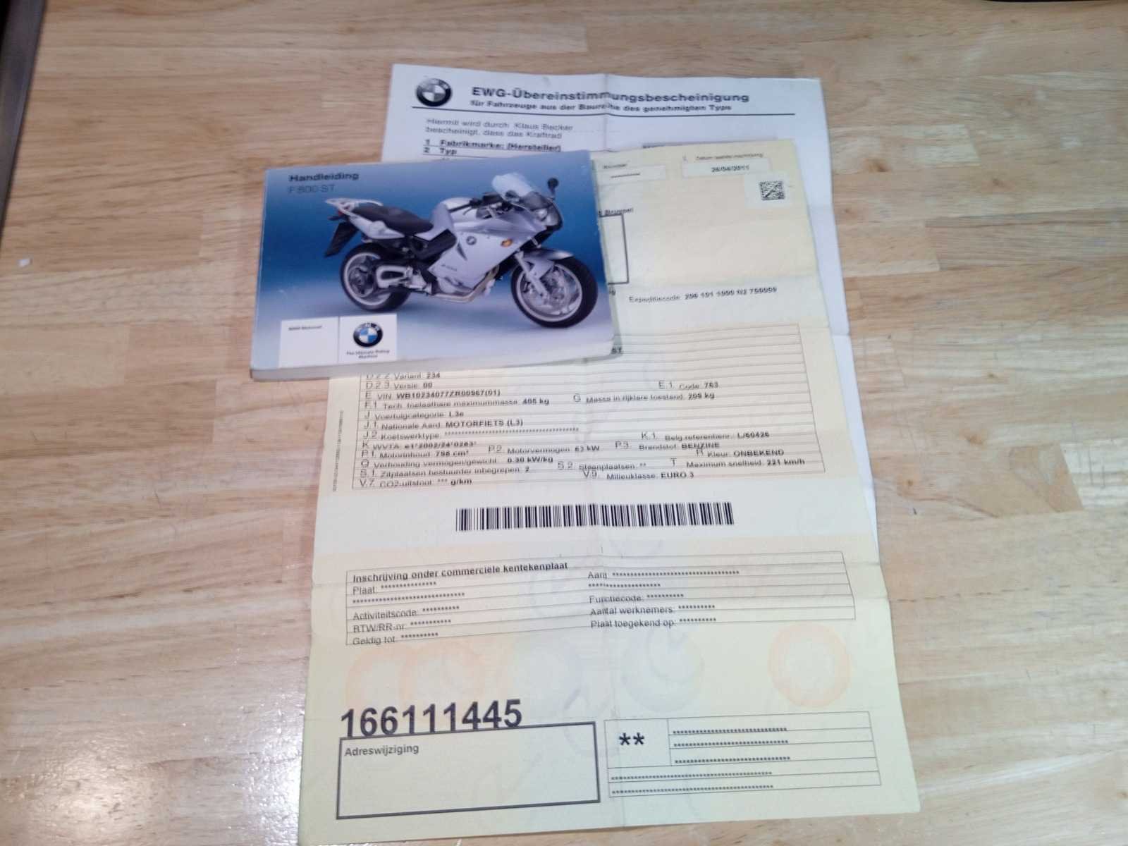 Inschrijvingsbewijs deel 1 en 2 aanwezig, gelijkvormigheidsattest aanwezig Opmerking: Lichte kuipschade Nee Merk: BMW Model: F800ST Brandstof: benzine Chassisnummer: WB10234077ZR00967 Cilinderinhoud: 800cc Datum eerste toelating: 15/11/2007 Vermogen (kW): 63kW Aantal sleutels: 1 Boorddocumenten aanwezig?: true Startinformatie: Start niet, accu leeg Bouwjaar: 2007