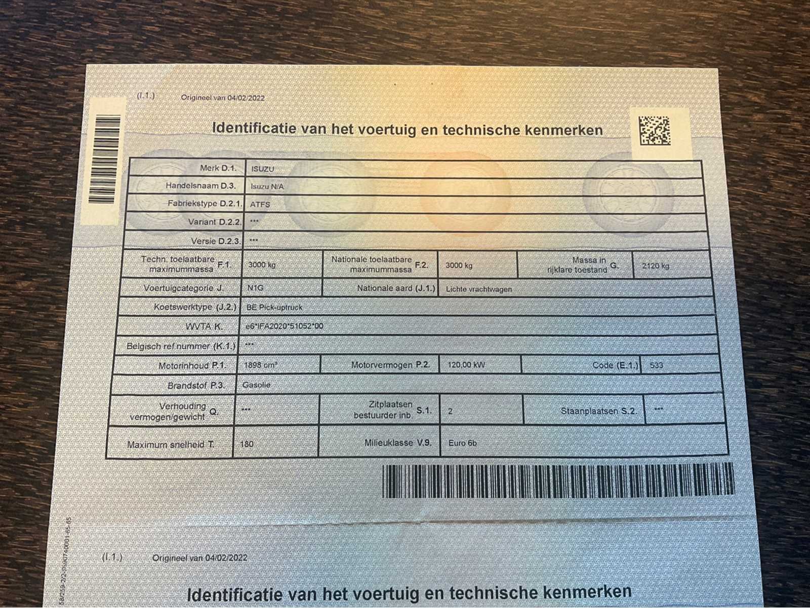 Isuzu D-Max enkele cabine, uitgerust met een Alumac aluminium casco met zij- en achterrolluiken. Robuust 4x4 voertuig, 1.9L diesel 120 kW, met airconditioning (Airco), stuurbekrachtiging en handgeschakelde 6-versnellingsbak. Het interieur is compleet, over het algemeen schoon, maar met activering van de airbag voor bestuurder en passagier. Het voertuig heeft een sleutel en de motor start - er kan alleen mee worden gereden om op te laden. Deurscharnier linksvoor kapot Schade aan de voor- en linkerkant RSV-procedure voor Frankrijk Technische keuring na herstelling in België Schade aan de voorkant: motorkap, bumpers, voor- en voorspatborden vervormd. Airbags geactiveerd (bestuurder + passagier). Gebroken linker voordeurscharnier. Rechter achtervleugel iets verzonken. Aluminium cel in goede algemene staat, functionele luiken. Dunlop AT20 banden op stalen velgen, goede staat. Visueel niet-gedraaid chassis. Non Merk: Isuzu Model: D-Max Type: 1.9 Simple cabine 4x4 Bouwjaar: 2020 Afgelezen kilometerstand: 78800km Cilinderinhoud: 1898cc Vermogen (kW): 120kW Brandstof: diesel Chassisnummer: MPATFS87JKT014466 Datum eerste toelating: 2020 Vermogen (pk): 163hp Aandrijving: Links Aantal zitplaatsen: 2 Kleur: Wit Transmissie: Handgeschakeld Aantal deuren: 2 Aantal sleutels: 1 Aantal cilinders: 4 Nationaliteit documenten: Belgique Start en rijdt: Demarre pour Chargement Vavato voert geen technische keuring uit.: true Airconditioning: true