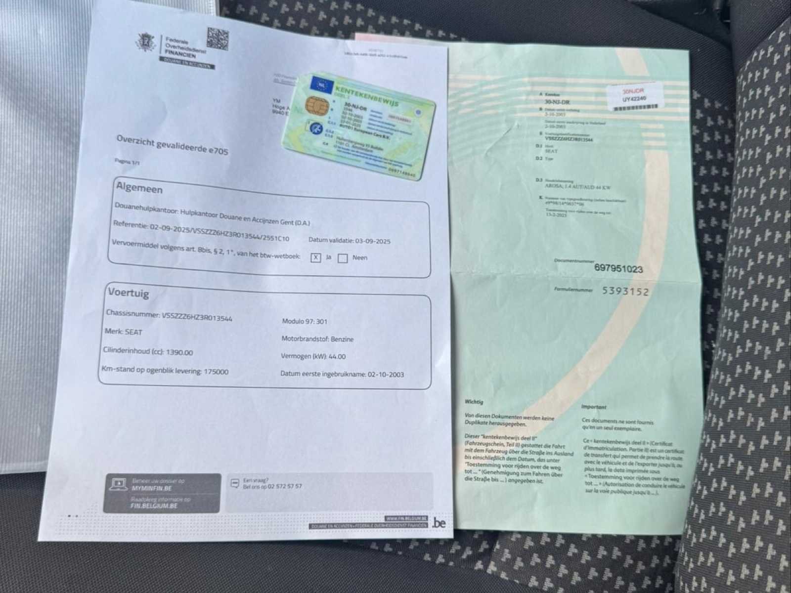 De wagen bevindt zich in gebruikte toestand. Opgelet NL documenten. No Merk: Seat Model: Arosa 1.4i 60 pk Bouwjaar: 2003 Afgelezen kilometerstand: 174962km Cilinderinhoud: 1390cc Vermogen (kW): 44kW Brandstof: Benzine Chassisnummer: VSSZZZ6HZ3R013544 Datum eerste toelating: 02/10/2003 Aantal zitplaatsen: 4 Kleur: Grijs Transmissie: Manueel Emissieklasse: Euro 4 Aantal deuren: 4 Nationaliteit documenten: Nederlands Vavato voert geen technische keuring uit.: true