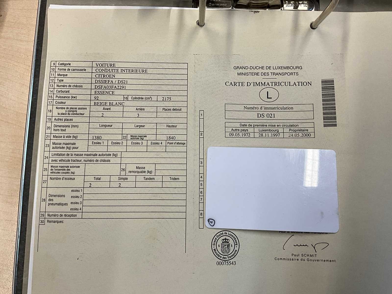 Het voertuig is volledig gerestaureerd en verkeert in uitzonderlijke staat Non Chassisnummer: DSFA03FA229 Merk: Citroën Model: DS 21 ie Afgelezen kilometerstand: 59150km Datum eerste inschrijving: 09/05/1972 Nationaliteit documenten: Luxembourgeoise Vermogen (pk): 125 Vermogen (kW): 92 Aantal deuren: 5 Stuurwiel: Gauche Cilinderinhoud: 2175 Aantal cilinders: 4 Ledig gewicht: 1380 Bouwjaar: 1972