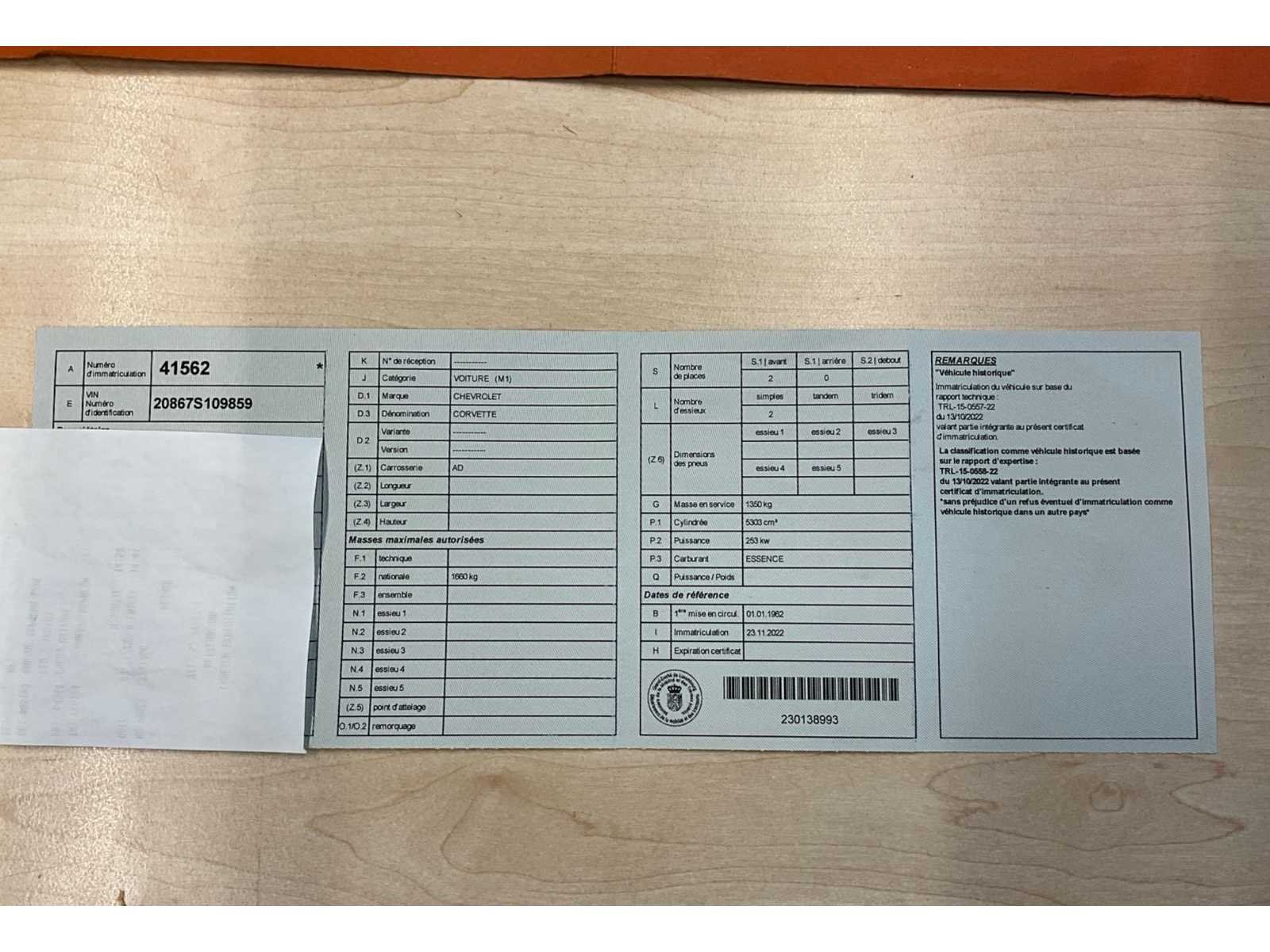 Non Chassisnummer: 20867S109859 Merk: Chevrolet Model: Corvette C1 Afgelezen kilometerstand: 63428km Brandstof: Essence Datum eerste inschrijving: 01/01/1962 Nationaliteit documenten: Luxembourgeoise Aandrijving: Oui Vermogen (kW): 253 Aantal deuren: 3 Aantal zitplaatsen: 2 Stuurwiel: Gauche Cilinderinhoud: 5303 Aantal cilinders: 8 Bouwjaar: 1961