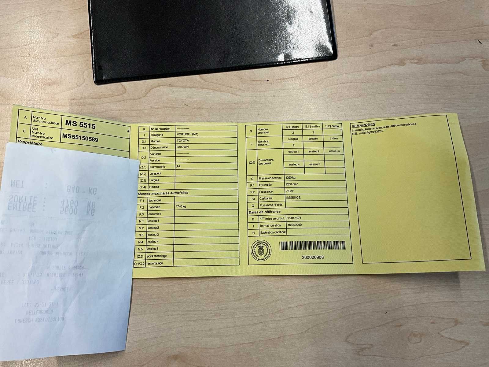 Eerste eigenaar Non Chassisnummer: MS55150589 Merk: Toyota Model: Crown Sedan Afgelezen kilometerstand: 65392km Brandstof: Essence Datum eerste inschrijving: 16/04/1971 Nationaliteit documenten: Luxembourgeoise Carrosserie: Sedan Aandrijving: Oui Transmissie: Manuelle Vermogen (kW): 78 Aantal deuren: 5 Aantal zitplaatsen: 5 Stuurwiel: Links Cilinderinhoud: 2253 Aantal cilinders: 6 Ledig gewicht: 1350 Bouwjaar: 1971